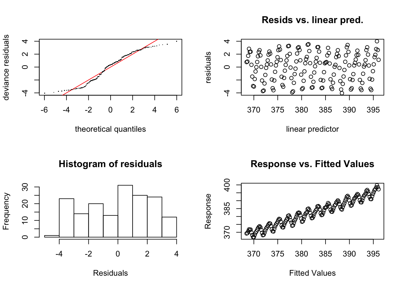 gam.check()함수는 네 개의 plot을 만들어 주는데 이들은 모형의 잔차를 각기 다른 방법으로 보여준다. 아래의 그림은 제대로 적합되지 않은 모형의 diagnostic plot을 보여준다. 왼쪽 위 그림은 Q-Q plot으로 모형의 잔차를 정규분포와 비교해준다. 잘 적합된 모형의 경우 잔차는 직선에 매우 근접한다. 아래 왼쪽은 잔차의 히스토그램으로 잘 적합된 모형의 경우 대칭적인 벨 형태를 기대할 수 있다. 오른쪽 위의 그림은 잔차의 그림으로 0 주위에서 고르게 분포하여야 한다. 마지막으로 오른쪽 아래 그림은 반응변수와 적합된 값을 나타낸 것으로 완벽한 모형인 경우 직선을 형성한다. 우리는 완벽한 모형을 기대하지는 않지만 (0,0)과 (1,1)을 지나는 직선 주위에 모여 있는 양상을 기대한다.