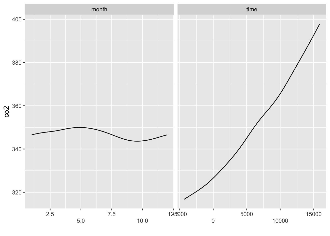 co2 ~ s(month, bs = "cc", k = 12) + s(time)
