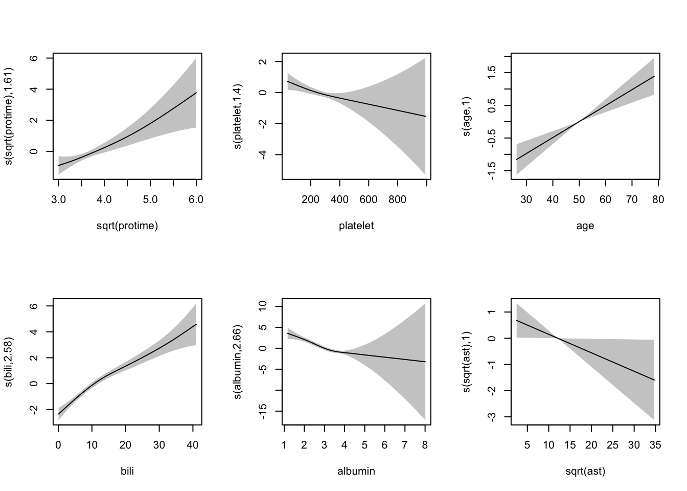 이 결과를 기저상태의 결과와 비교해보면 프로트롬빈시간(sqrt(protime))과 혈소판(platelet), 알부민(albumin)의 경우 추정효과가 보다 비선형이라는 근거를 보이고 있으며 나이의 경우 선형효과를 보이고 있다. 효과의 방향과 넓은 신뢰구간은 변화가 없다.