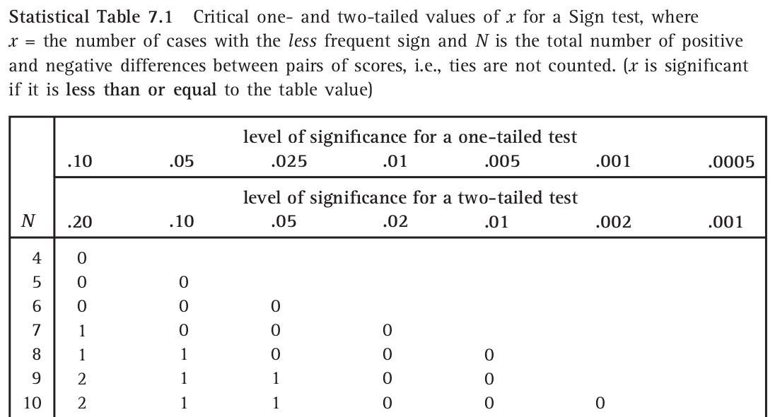 在本例中, \(X=11\)。如果(像在考試的時候沒有電腦輔助)要用查表的方式判斷 \(p\) 值大小。可以先下載 一份統計數據的表格。下載好了找到 “Statistical Table 7.1 Critical one- and two-tailed values of x for a Sign test” 在第185頁:(下面只是截圖)