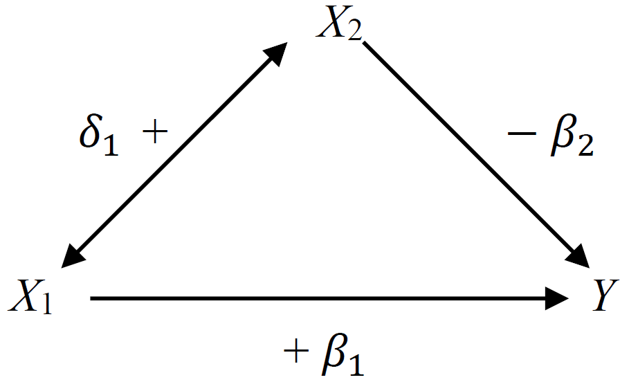 按圖所示,當 \(X_2\) 保持不變,\(X_1\) 與因變量 \(Y\) 正相關 (\(\beta_1>0\))。但是,兩個預測變量之間 \(X_1, X_2\) 也呈正相關關係 \(\delta_1 >0\)。而同時,\(X_2\) 的升高會導致因變量 \(Y\) 的下降 ($_2 <0 $)。這種情況就意味著,如果,我們不調整 \(X_2\) (使之保持不變),那麼 \(X_1\) 每升高一個單位,\(Y\) 的變化會低於調整 \(X_2\) 時,\(X_1\) 的變化所引起的 \(Y\) 的變化。如果這時候 \(\beta_2,\delta_1\) 較大,那麼對於 \(X_1\) 來說,調整 \(X_2\) 前後,回歸係數的變化較大,如果大到一定程度,甚至調整前後的回歸係數的方向 (正負) 都會發生變化。