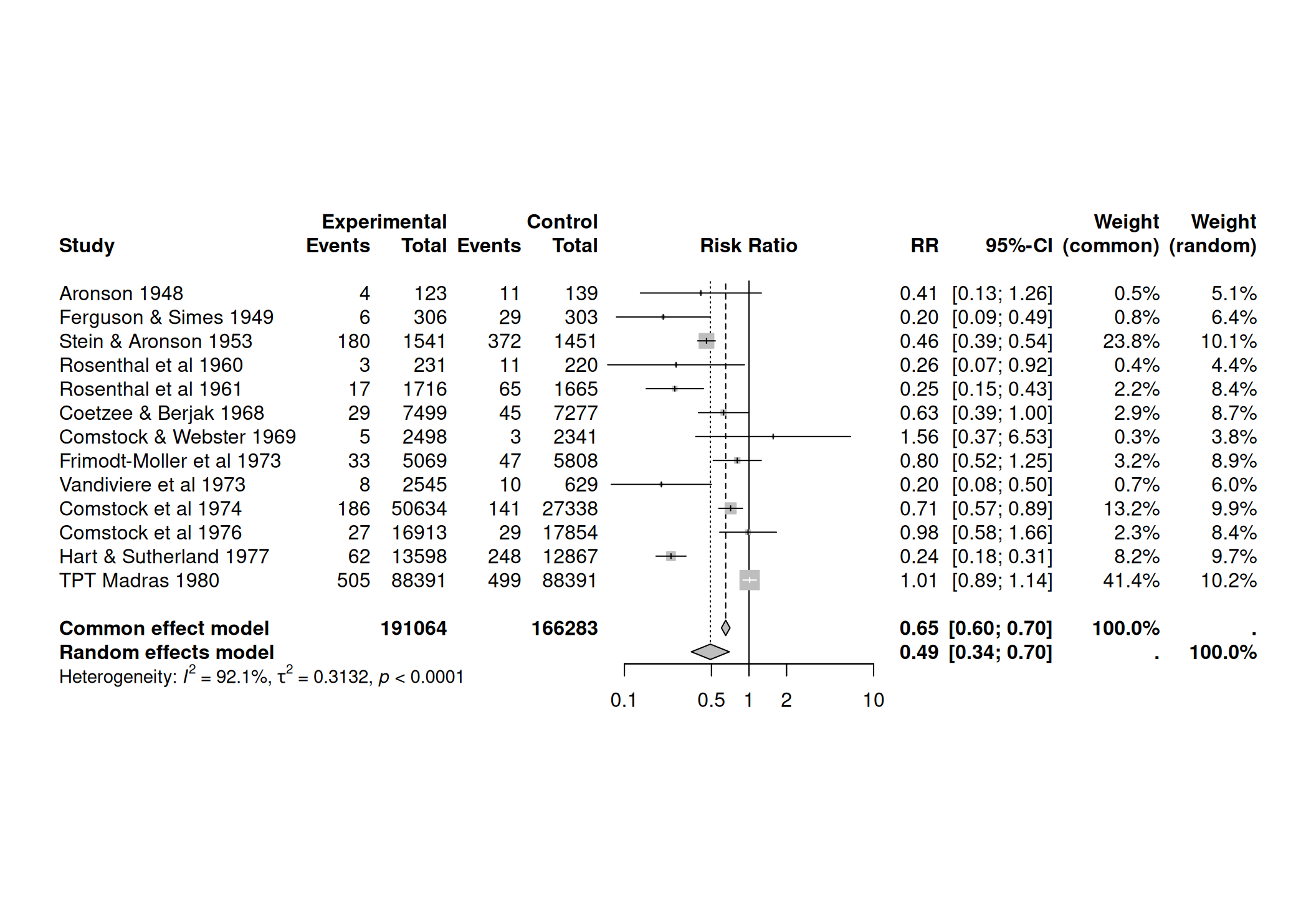 Figure 15.2 also shows the results of a random effects analysis, together with the estimated Higgins’ \(I^2\) and heterogeneity variance \(\tau^2\).