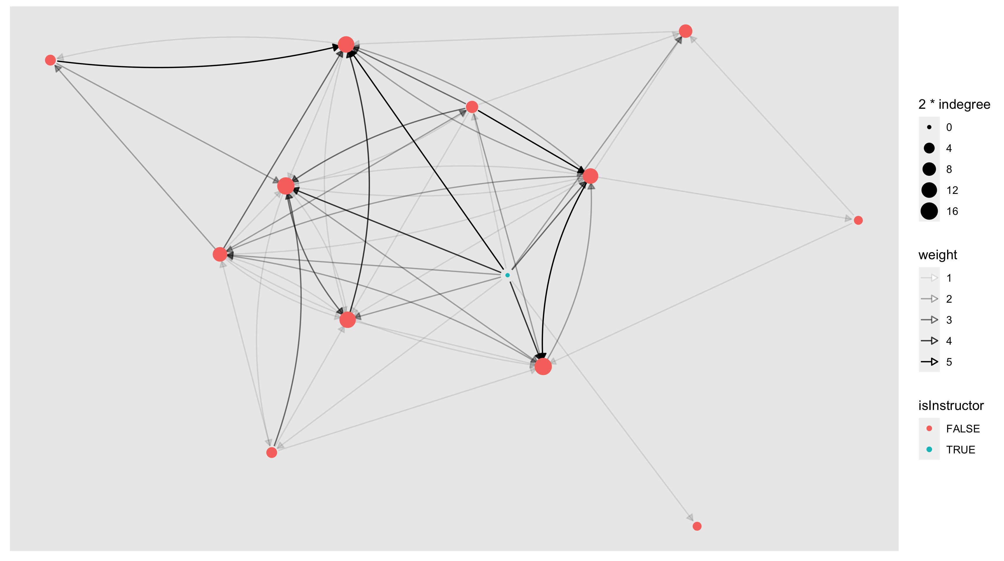 This network visualization is slightly more complex than the one you create in Lab 1. I used a node-level measure named indegree to scale the size of each node and an edge attribute named weight to scale the width of each edge. In other words, the bigger a node is, the more replies this person has received; the thicker an edge is, the more replies it represents. I also colored the instructor (myself) in blue, and it is helpful for me to see my replies reaching most members of our class community.