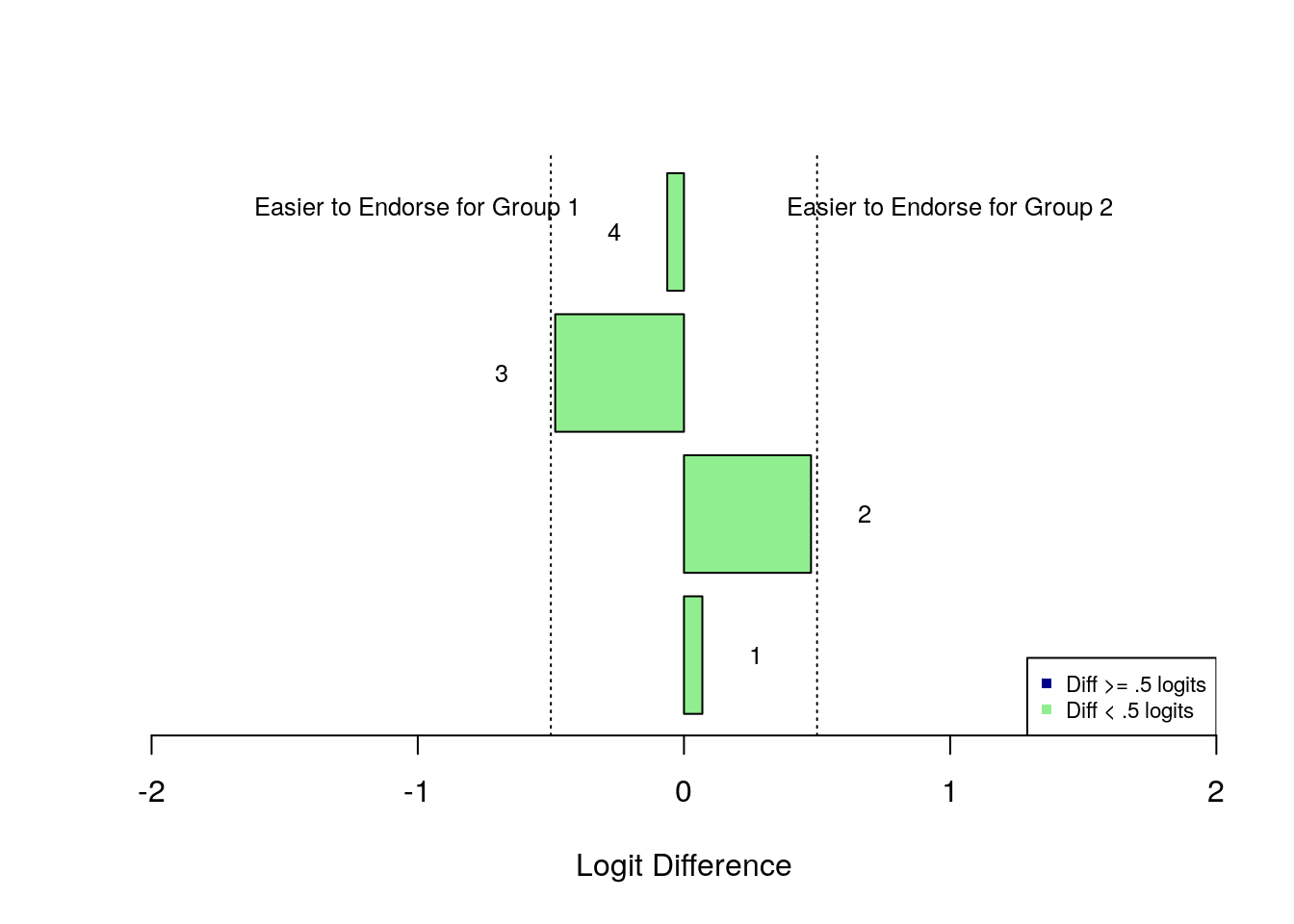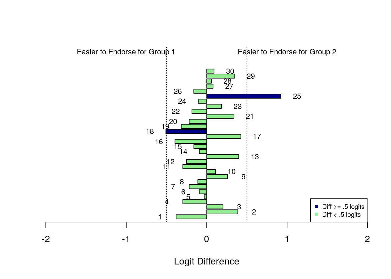 Finally, Figure 3 is a bar plot that illustrates the direction and magnitude of the differences in item difficulty between subgroups. In the plot, each bar represents the difference in difficulty between subgroups for an individual item, ordered by the item sequence in the survey. Bars that point to the left of the plot indicate that the item was easier to endorse for Subgroup 1, and bars that point to the right of the plot indicate that the item was easier to endorse for Subgroup 2. Dashed vertical lines are plotted that show values of +0.5 and -0.5 logits as an indicator of substantial differences in item difficulty between subgroups.