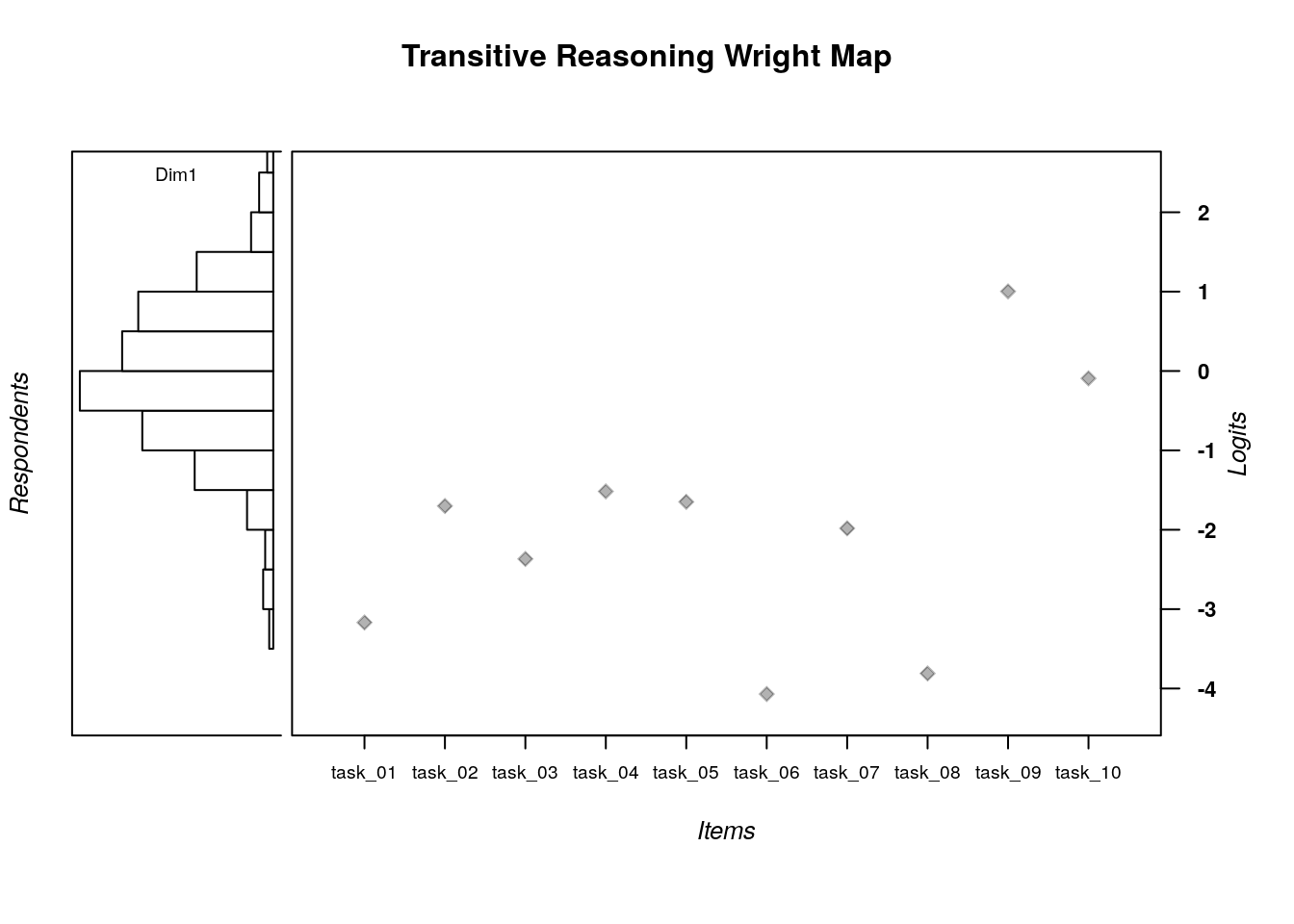 In this Wright Map display, the results from the dichotomous Rasch model analysis of the transitive reasoning data are summarized grapihcally. The figure is organized as follows:
