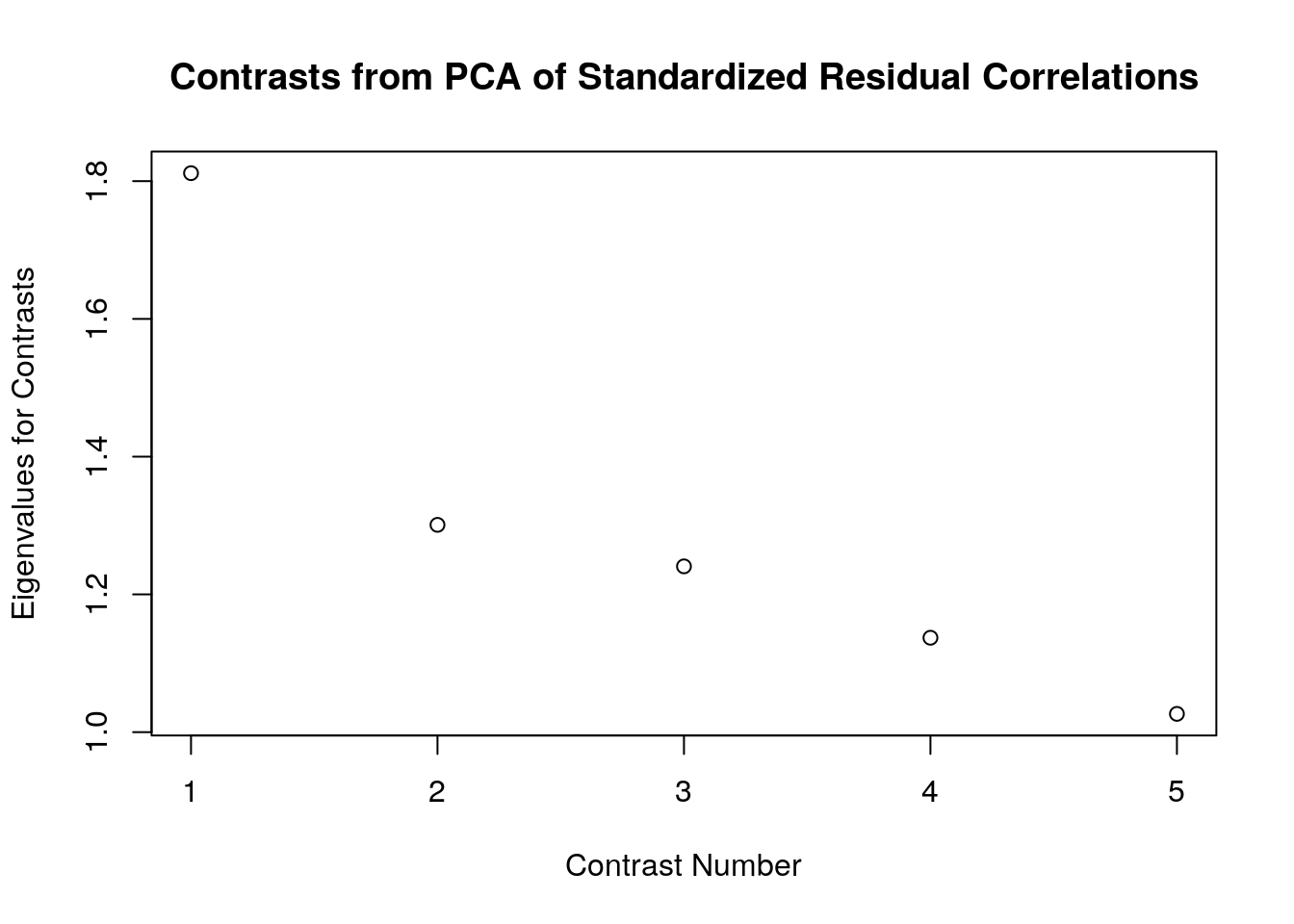 In this example, all of the contrasts have eigenvalues that are smaller than Linacre’s (2016) critical value of 2.00. This result suggests that the correlations among the model residuals primarily reflect randomness (i.e., noise)–thus providing evidence that the responses adhere to the Rasch model requirement of unidimensionality.