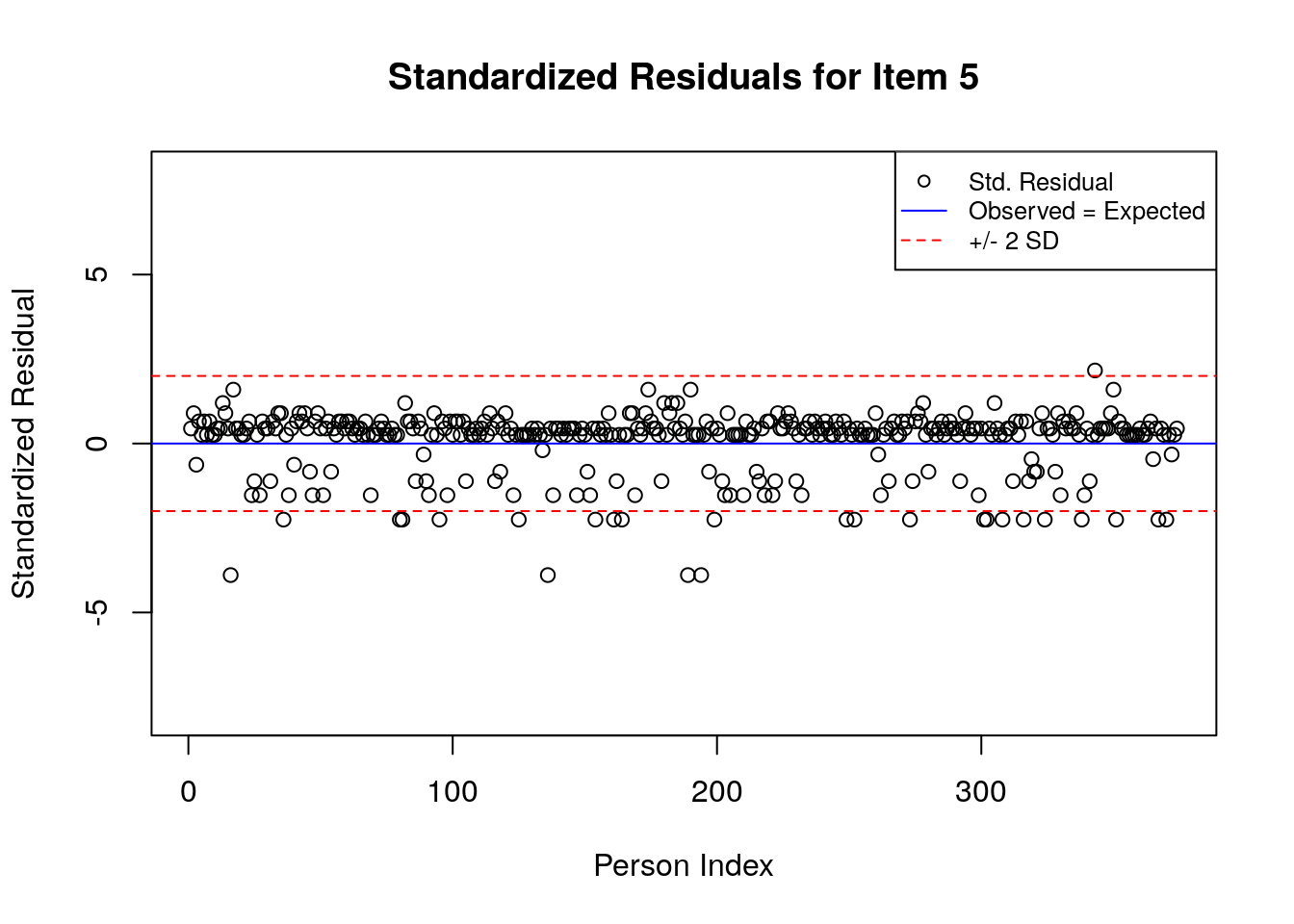 A separate plot is produced for each item. In each plot, the y-axis shows values of the standardized residuals, and the x-axis shows the persons (in this case, students), ordered by their relative ordering in the data. Open-circle plotting symbols show the standardized residual associated with each person’s response to the item of interest.
