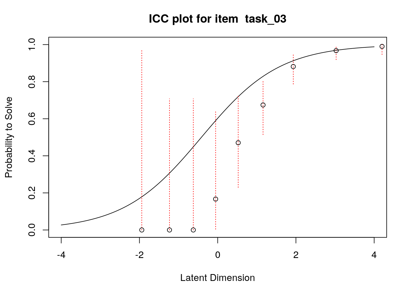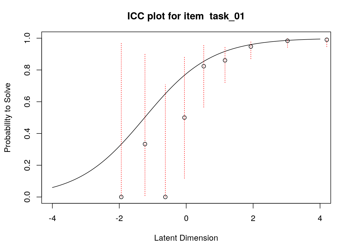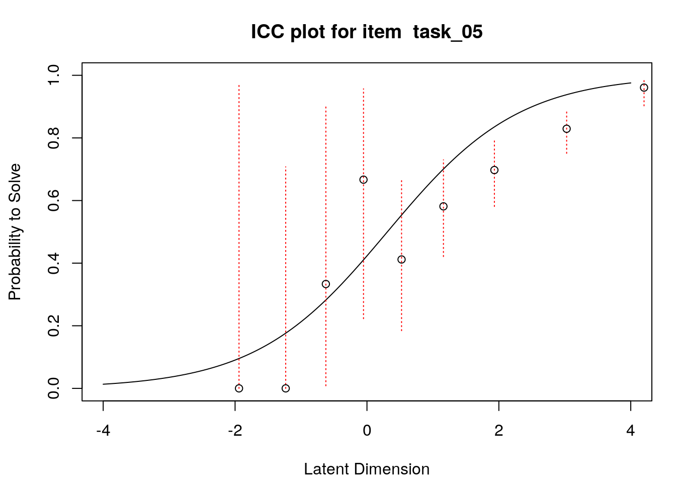 A separate plot is produced for each item. In each plot, the y-axis shows model-predicted probability for a correct or positive response (labeled “Probability to Solve” by default in the eRm package)), and the x-axis shows the latent variable (labeled “Latent Dimension” by default in the eRm package).The solid line shows the model-expected IRF. Open-circle plotting symbols show the observed probability for a correct response at various locations on the latent variable. Dashed vertical lines show a 95% confidence interval around the observed probabilities. Alignment between the model-expected IRF and the observed probabilities (i.e., circles that are close to the model-expected IRF) provide evidence of good model-data fit.
