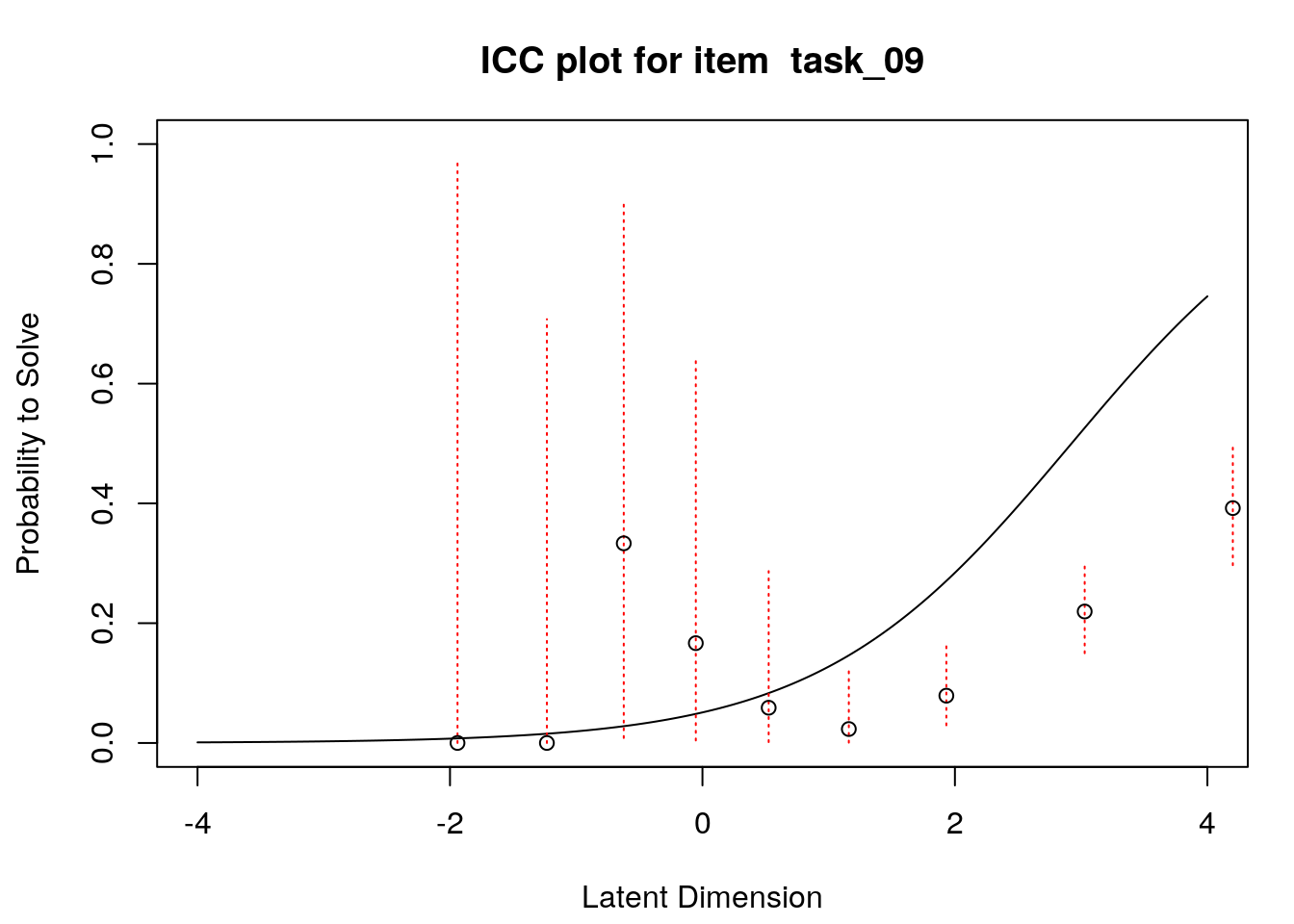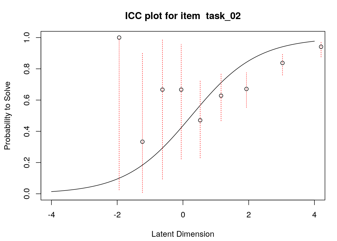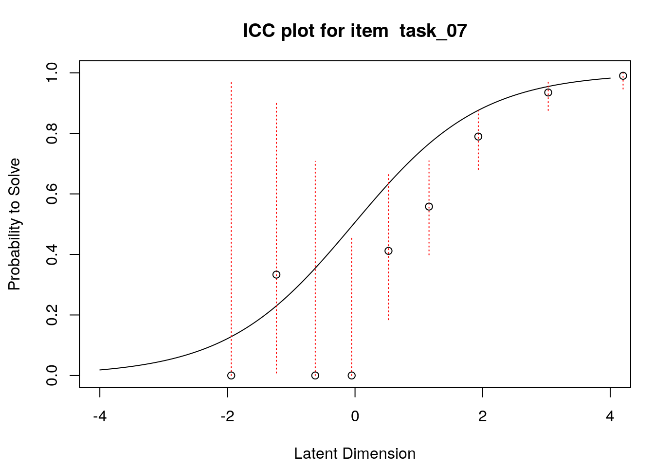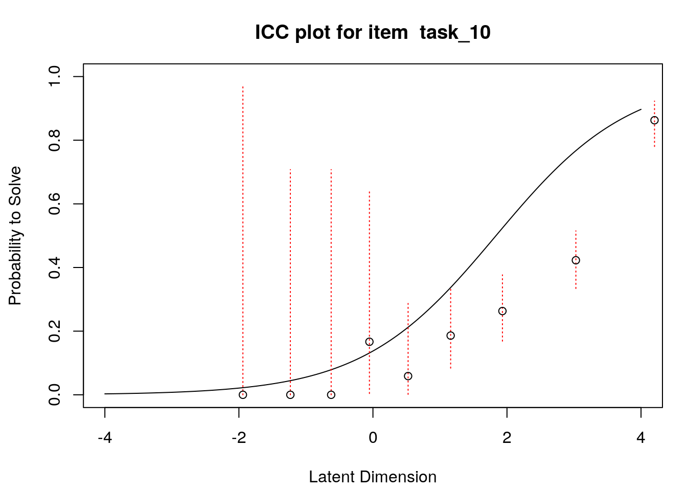 A separate plot is produced for each item. In each plot, the y-axis shows model-predicted probability for a correct or positive response (labeled “Probability to Solve” by default in the eRm package)), and the x-axis shows the latent variable (labeled “Latent Dimension” by default in the eRm package).The solid line shows the model-expected IRF. Open-circle plotting symbols show the observed probability for a correct response at various locations on the latent variable. Dashed vertical lines show a 95% confidence interval around the observed probabilities. Alignment between the model-expected IRF and the observed probabilities (i.e., circles that are close to the model-expected IRF) provide evidence of good model-data fit.