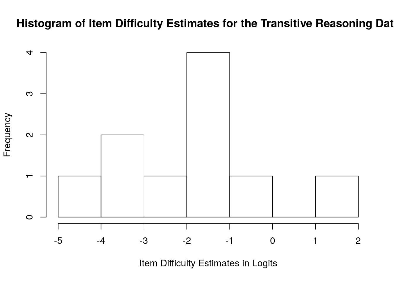 hist(difficulty$xsi, main = "Histogram of Item Difficulty Estimates for the Transitive Reasoning Data",
