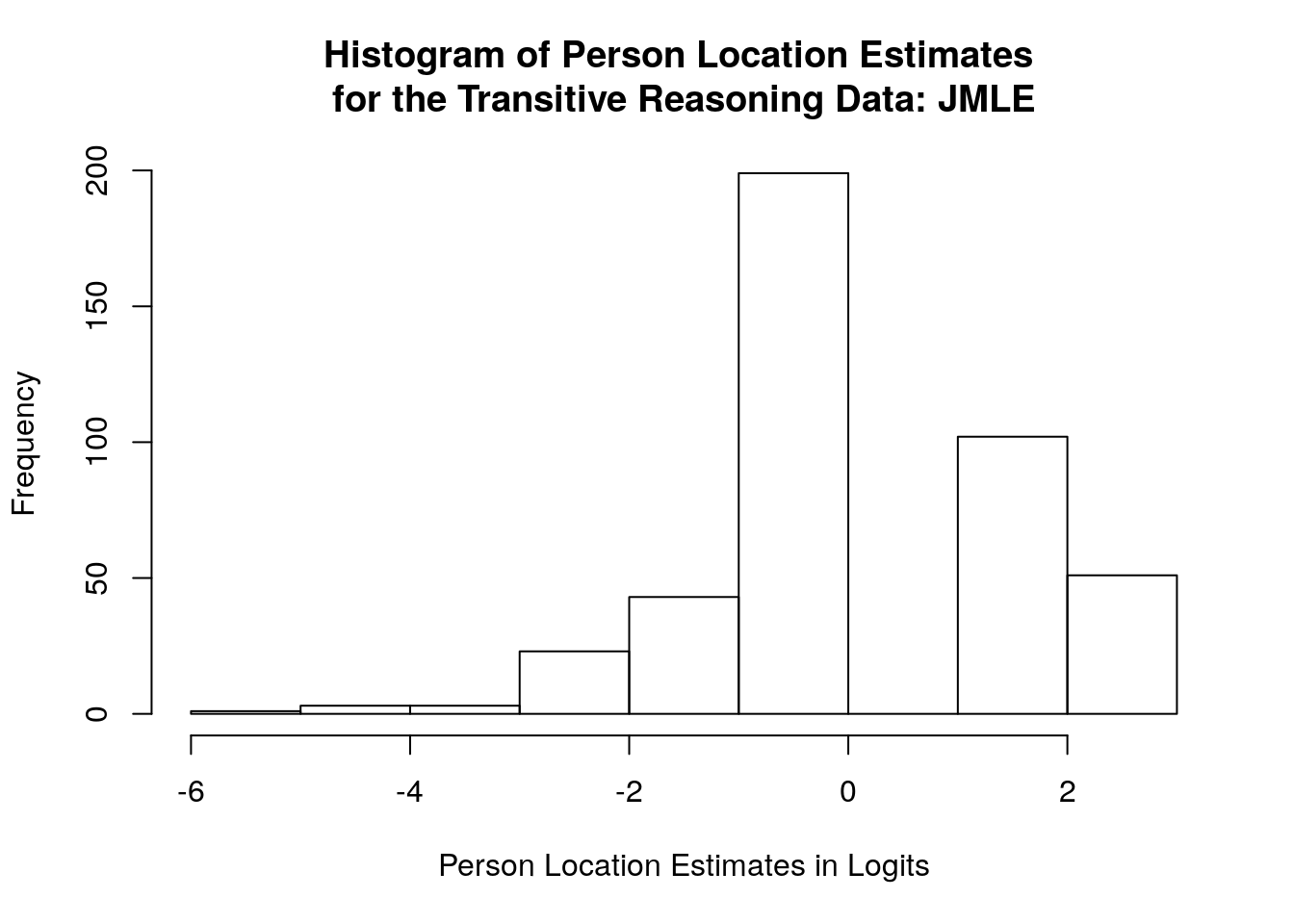 The next step in our analysis is to examine person location parameters (i.e., person achievement or ability estimates). When the default MMLE method is used to estimate the dichotomous Rasch model, person parameters are calculated after the item locations are estimated. As a result, the person estimation procedure for this model requires additional iterations.