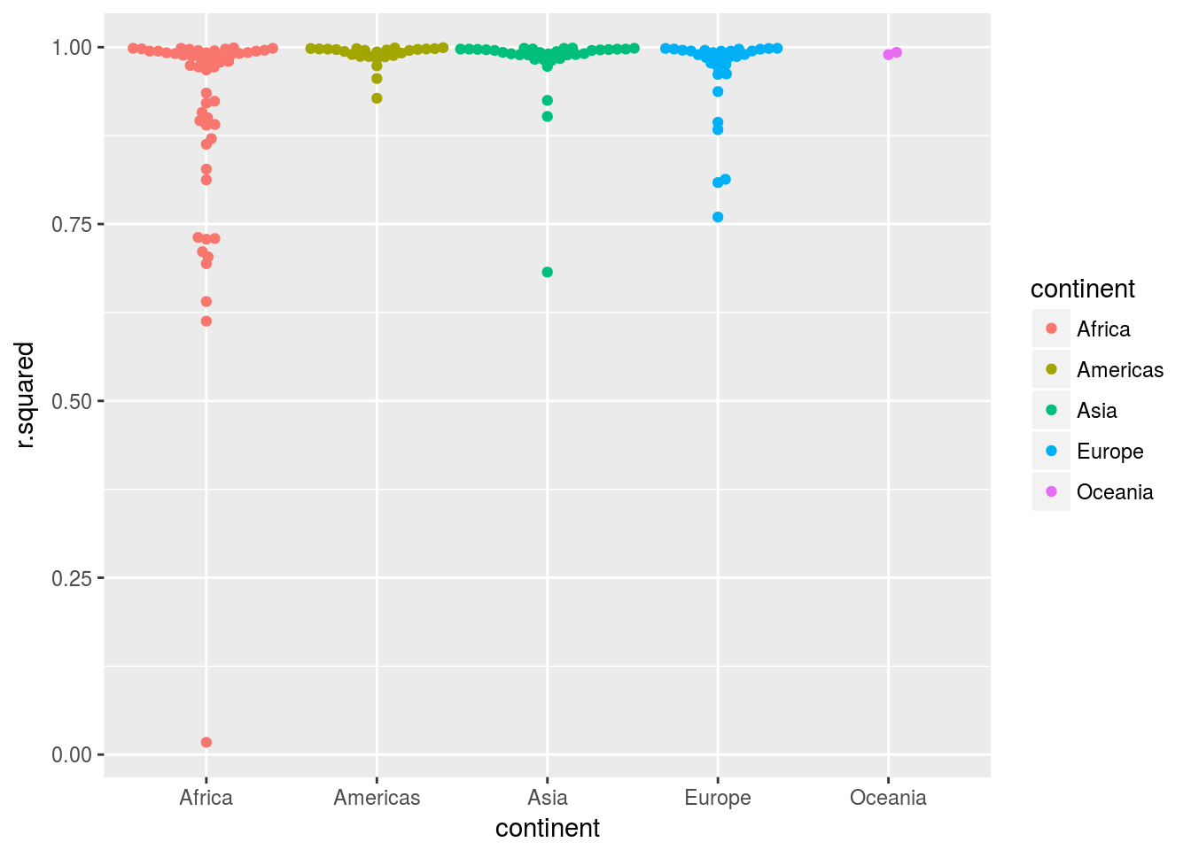 # drop the list columns, `data`, `model` and `resid`Note that each model gives a set of metrics.
