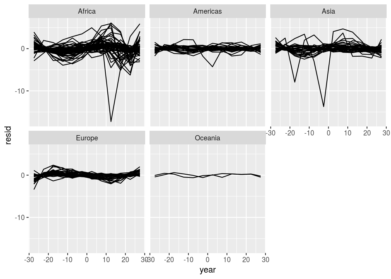 Note that each row is one data point in the original gapminder but the resid calculated is based on the country-wise model.