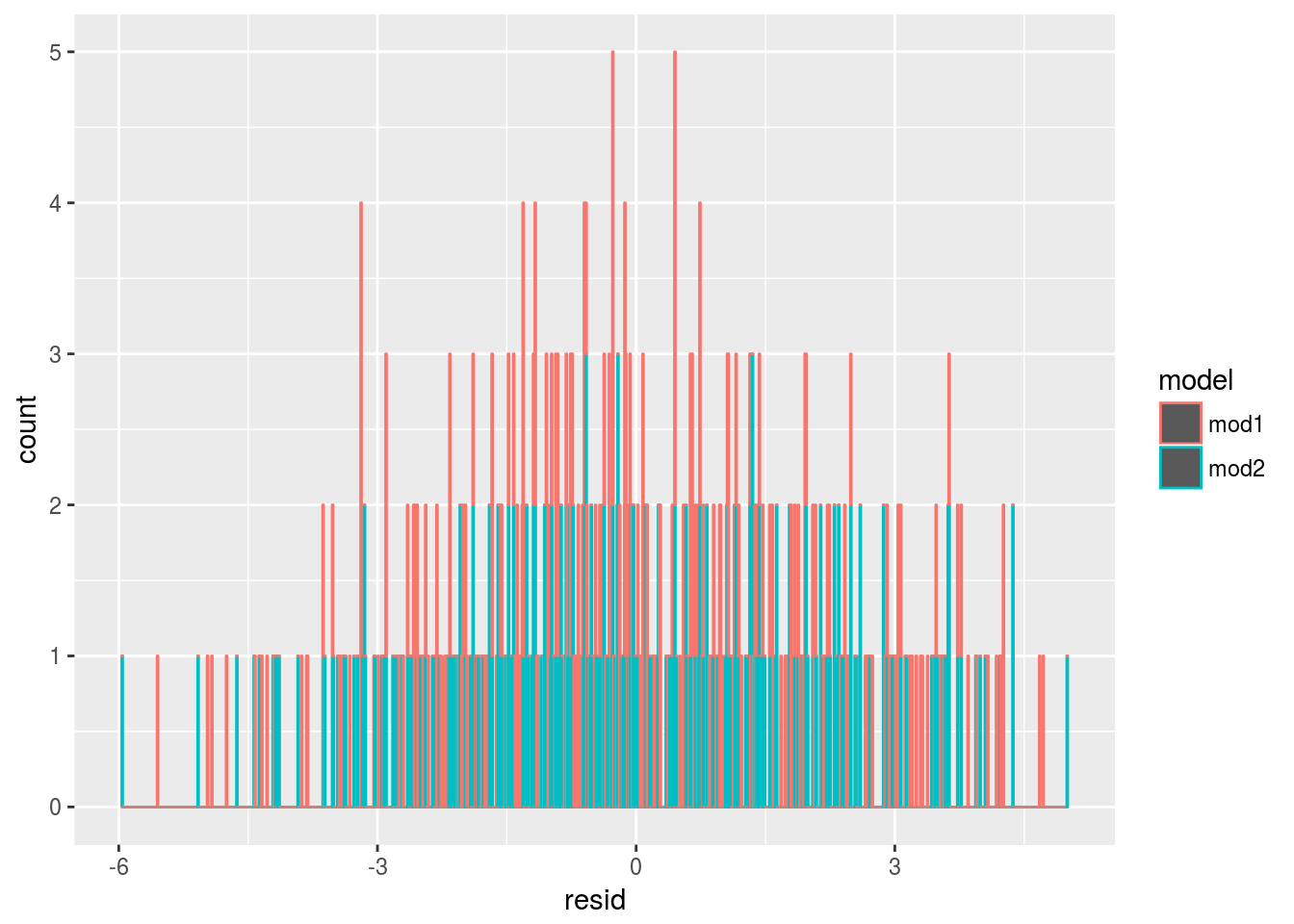 sim4 <- sim4 %>% gather_residuals(mod1,mod2)Plot the residual’s distribution