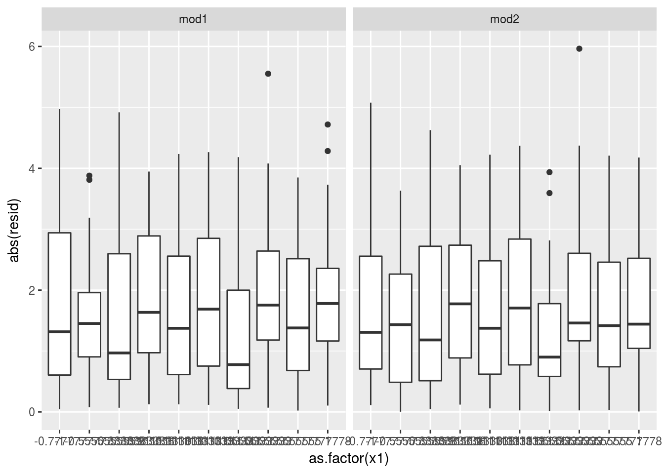 ggplot(aes(y=abs(resid),x = as.factor(x1)))+