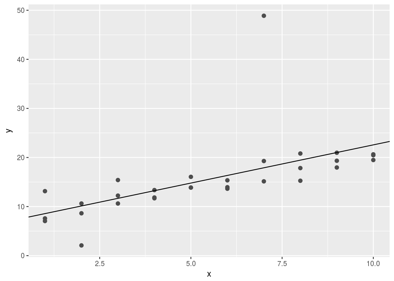 - One downside of the linear model is that it is sensitive to unusual values because the distance incorporates a squared term. Fit a linear model to the simulated data below, and visualise the results. Rerun a few times to generate different simulated datasets. What do you notice about the model?