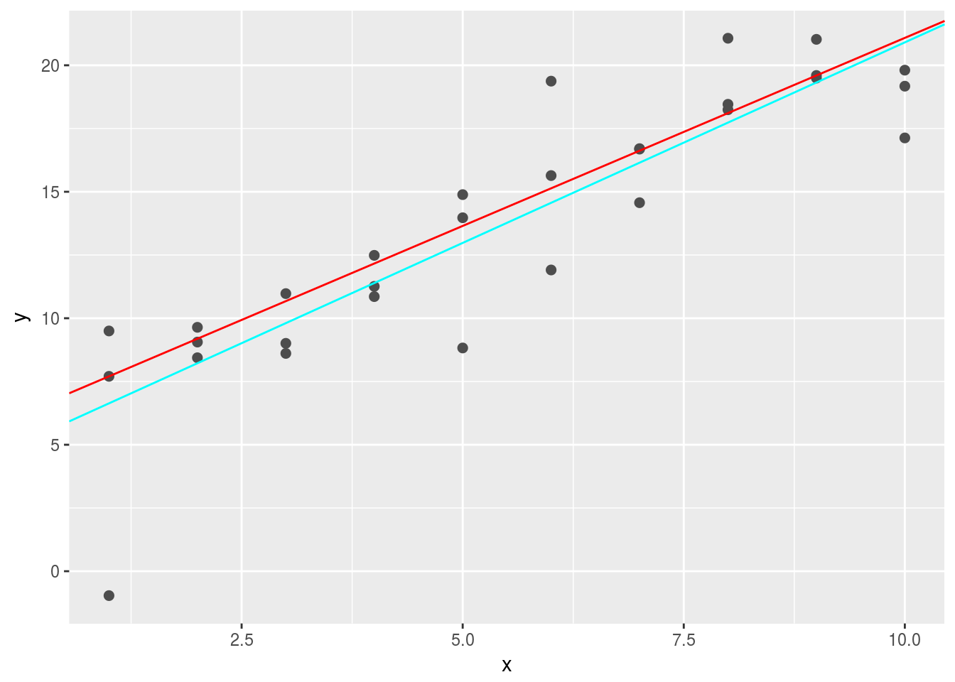 geom_abline(intercept = best2$par[1],slope = best2$par[2], color = "cyan")