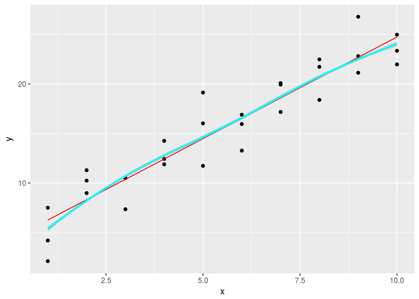 geom_smooth(data = grid2, aes(y = pred),color = 'cyan')## `geom_smooth()` using method = 'loess'