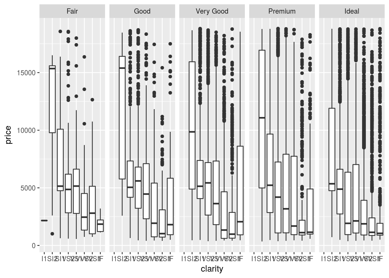 library(lubridate)24.2 Why are low quality diamonds more expensive