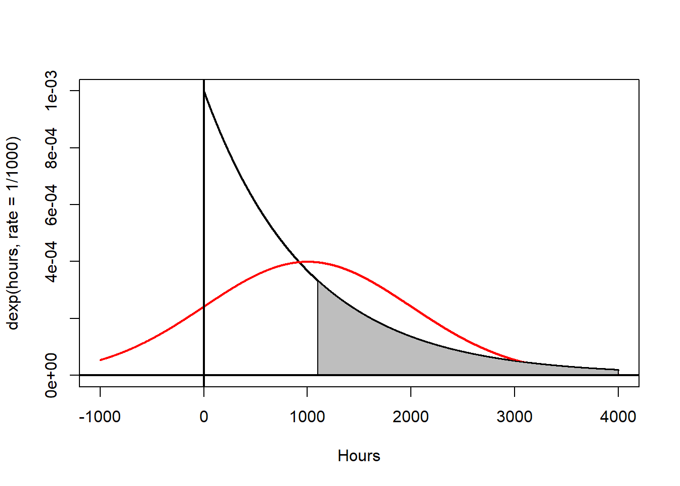 The lifetime of a certain insect could be described by an exponential distribution with mean \(\mu=1000\) hours and standard deviation \(\sigma=1000\) hours. This distribution is heavily skewed and non-normal. This particular continuous distribution is sometimes used to model survival times when deaths/failures happen randomly. More advanced distributions (such as the Weibull) can more accurately model survival when deaths/failures do not occur randomly. When most deaths/failures occur early, an ‘infant-mortality’ model is used, while if most deaths/failures occur later, an ‘old-age wearout’ model is used.