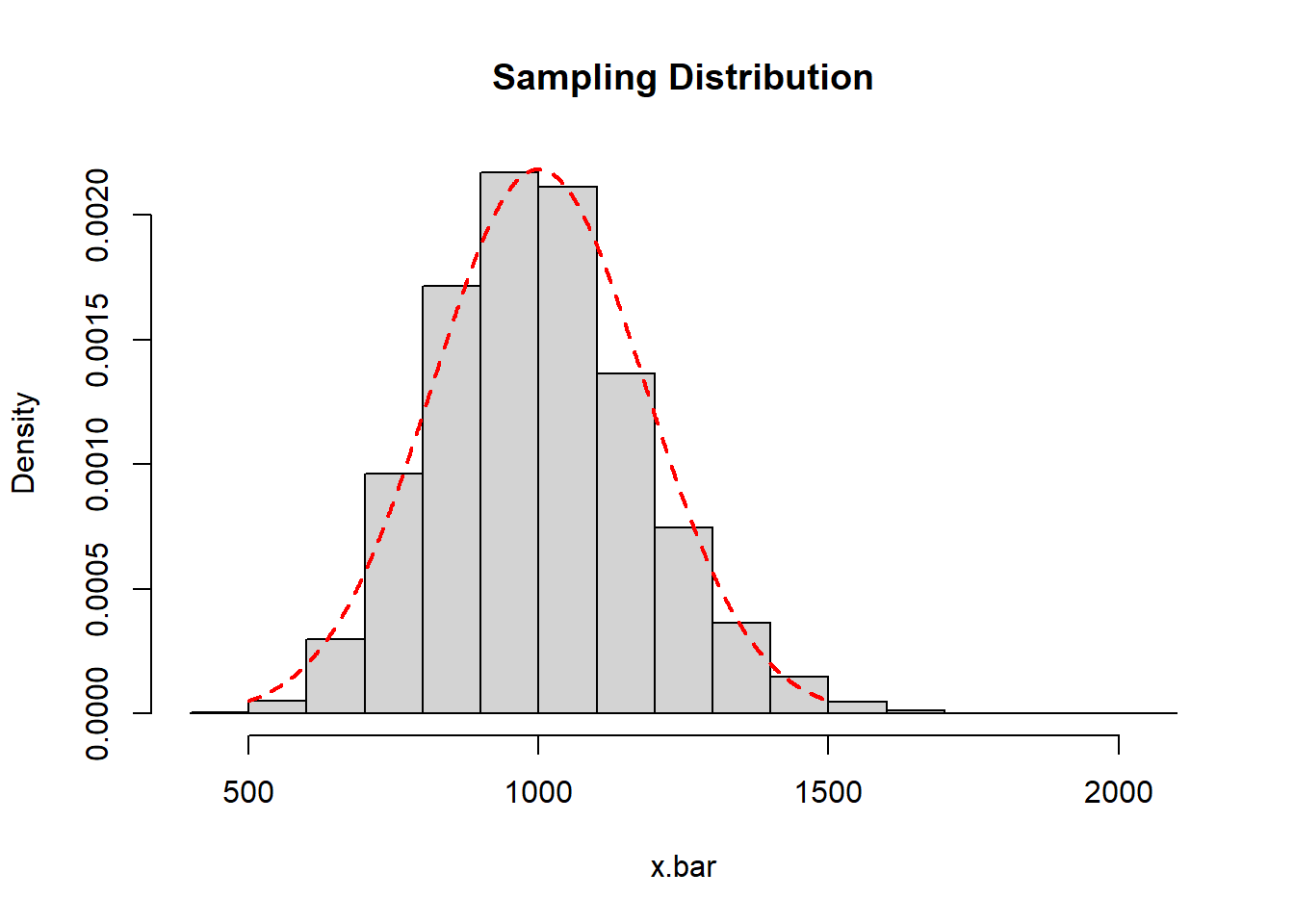 I will simulate the sampling distribution and draw its histogram, superimposing a normal curve with mean \(\mu_{\bar{x}}=1000\) and standard error \(\sigma_{\bar{x}}=\frac{1000}{\sqrt{30}}=\) 182.5741858 on top of it.