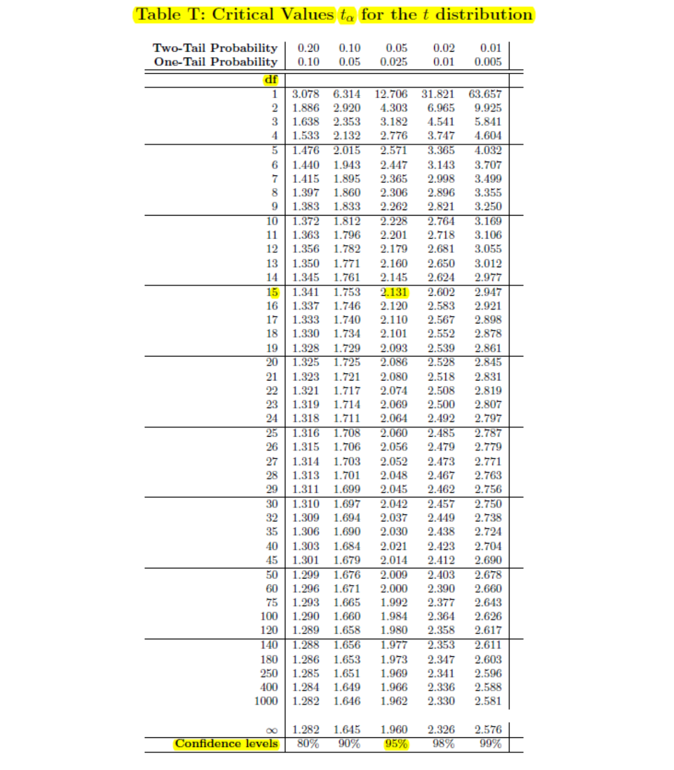 The \(t\) critical value can be obtained with technology. Use invT(.025,15) and invT(.975,15) on a TI calculator. You should still get \(t=\pm2.131\).