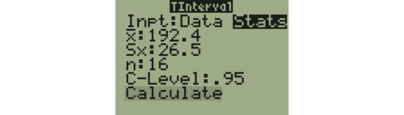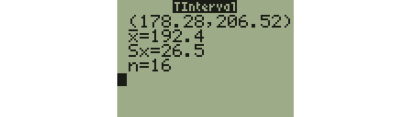 If \(n=16\) (so \(df=15\)), \(\bar{x}=192.4\) and \(s=26.5\), then the 95% confidence interval for \(\mu\) is: