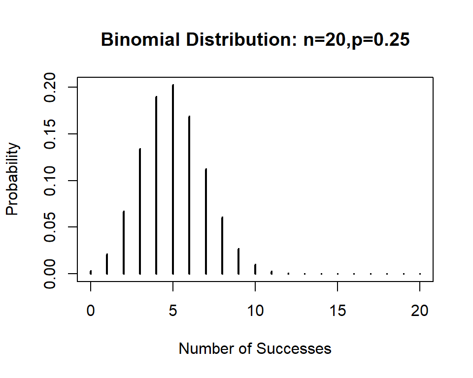 What happens to the shape of the binomial distribution as \(n\) gets large? Here’s the picture of our binomial example