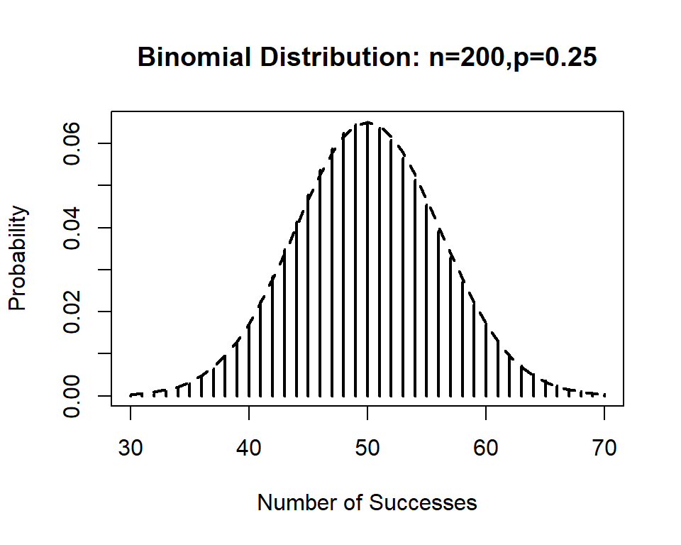 This is right skewed. Now I will increase \(n=200\); notice the new graph is almost perfectly symmetric and is similar to the normal distribution. The dotted line is a normal distribution with the same mean and standard deviation as the binomial; \(\mu=200(.25)=50\), \(\sigma=\sqrt{200(.25)(.75)}=\sqrt{37.5}\)