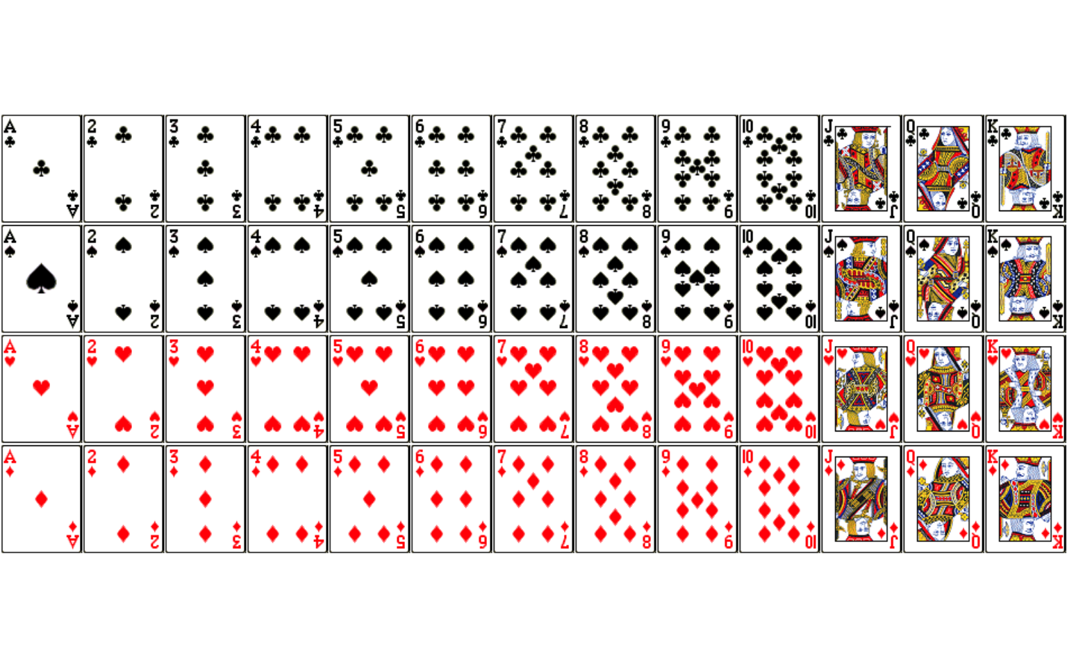 A standard deck of cards contains 52 cards. The cards are divided into 4 suits (spades, hearts, diamonds, clubs), where the spades and clubs are traditionally black and the hearts and diamonds are red. The deck is also divided into 13 ranks (2, 3, 4, 5, 6, 7, 8, 9, 10, Jack, Queen, King, Ace). The Jack, Queen, King are traditionally called face cards. The Ace can count as the highest and/or lowest ranking card, depending on the particular card game being played.