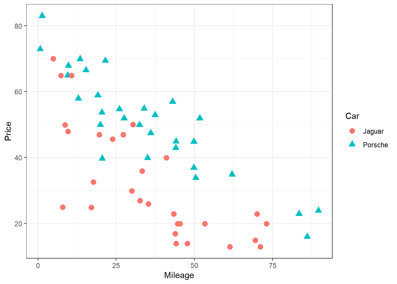 Let’s look at a scatterplot, where different colors and shapes have been used to distinguish between Jaguars and Porsches.