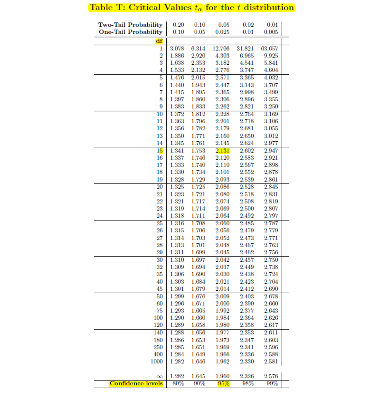 One complication is that it is very common for paired samples \(t\)-tests to be one-sided, since we generally have a particular direction we expect the effect to be in. It is possible to compute a one-sided confidence interval (it appears in the computer output above), but I’m going to not present that formula and instead will just review confidence interval for a mean. Let’s do a 90% confidence interval.