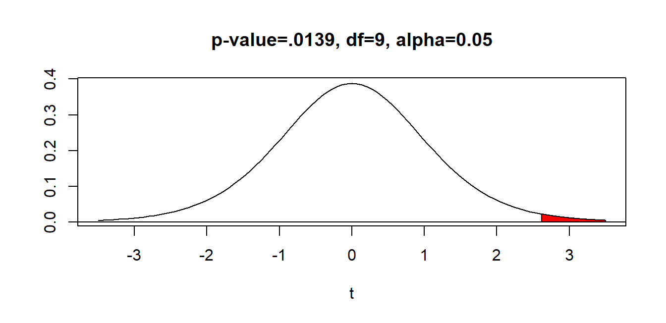 The \(p\)-value is \(P(t>2.62)\). With \(df=9\), notice our test statistic is between the critical values \(t^*=2.262\) and \(t^*=2.821\), which correspond to one-tail probabilities of \(0.025\) and \(0.01\), respectively. This means that \[0.01 < p-value < 0.025\]