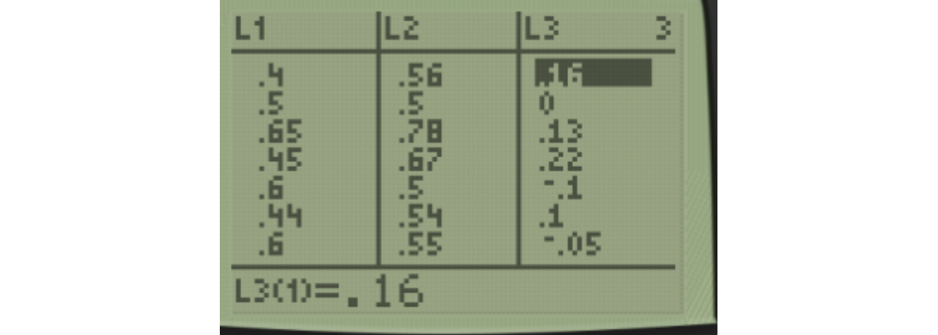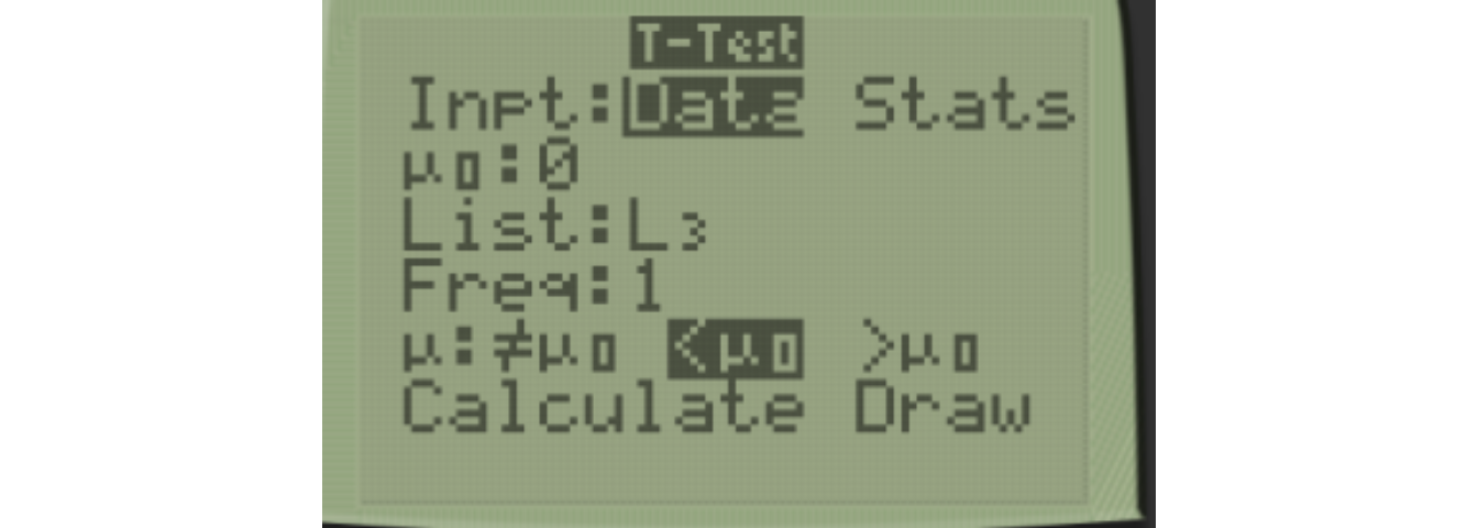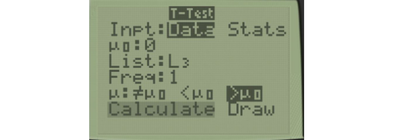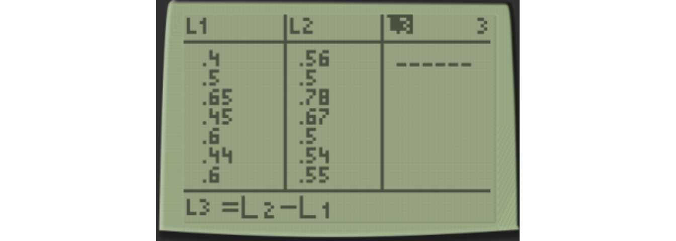 Once you hit ENTER and get values in List L3, then the paired samples \(t\)-test or confidence interval will just be doing the one-sample test or CI on the differences, as we did before.