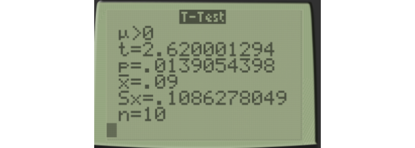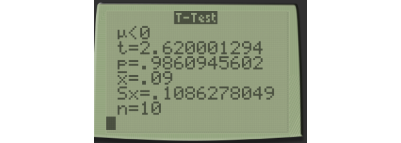 \[t=\frac{\bar{d}-\mu_0}{s_d/\sqrt{n}}\] \[t = \frac{0.09 - 0}{0.1086/\sqrt{10}}\]
