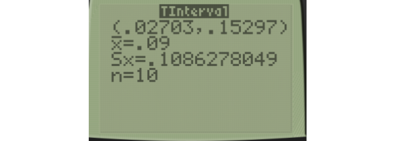 We have \(n=10\), so \(df=9\) and the critical value for 99% confidence is \(t^* = 1.833\).