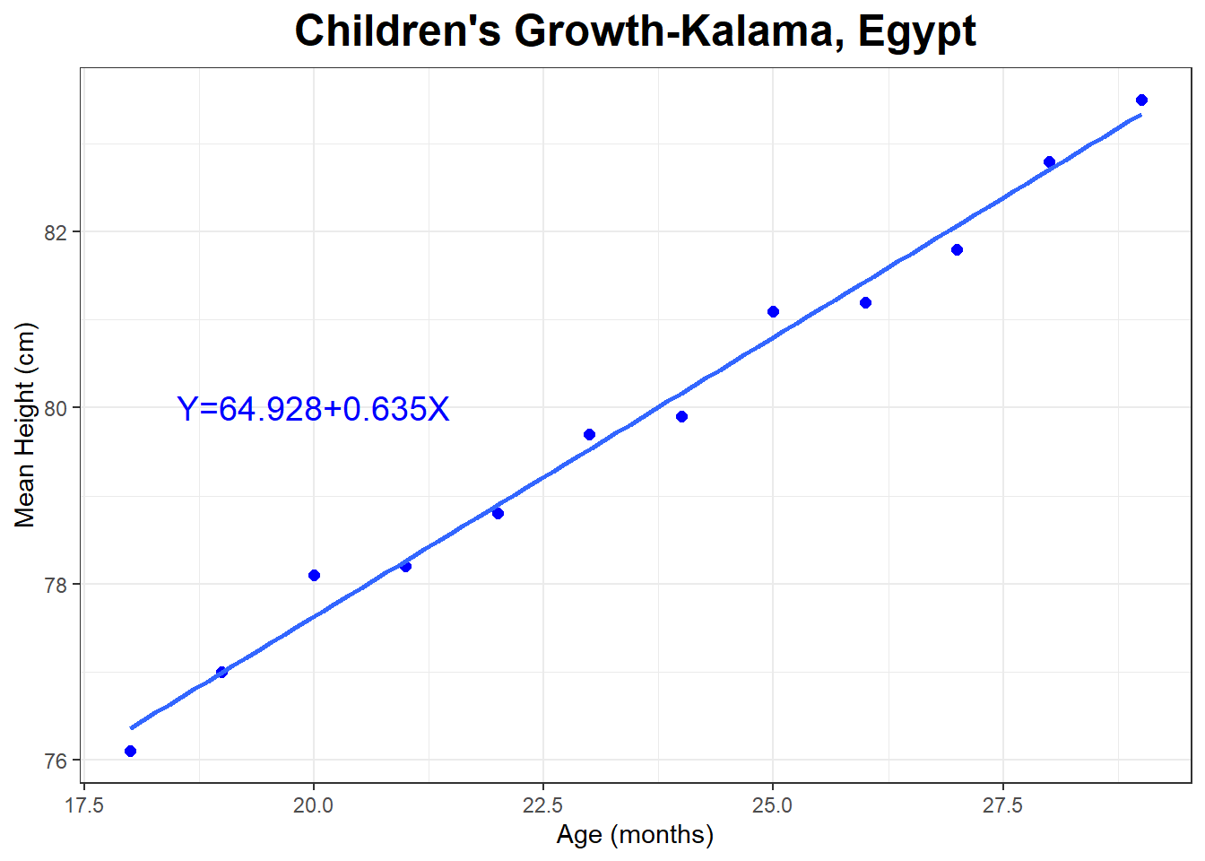 The graph and regression line below show the relationship between the mean height (in cm) and age (in months) of young children in Kalama, Egypt.