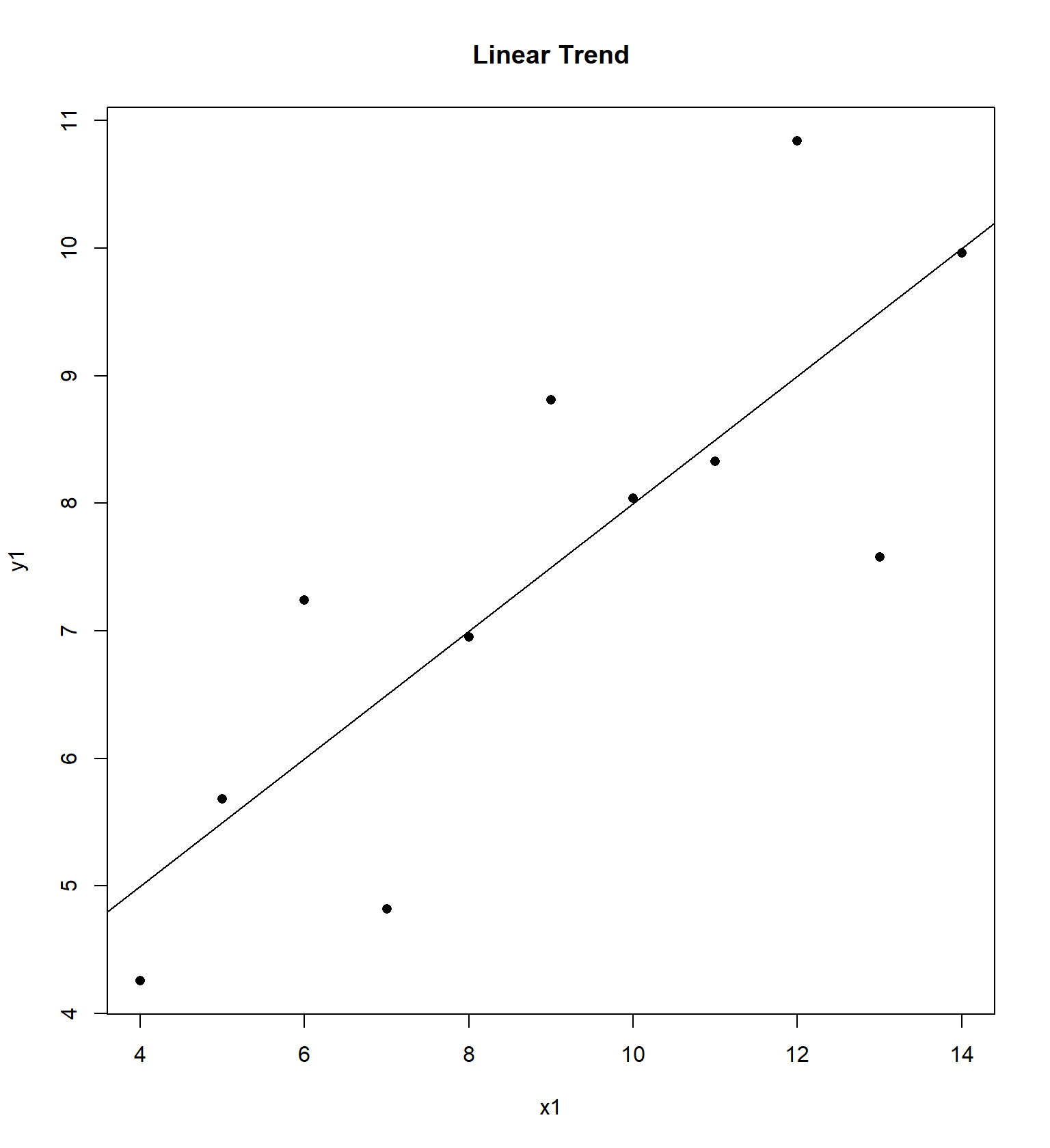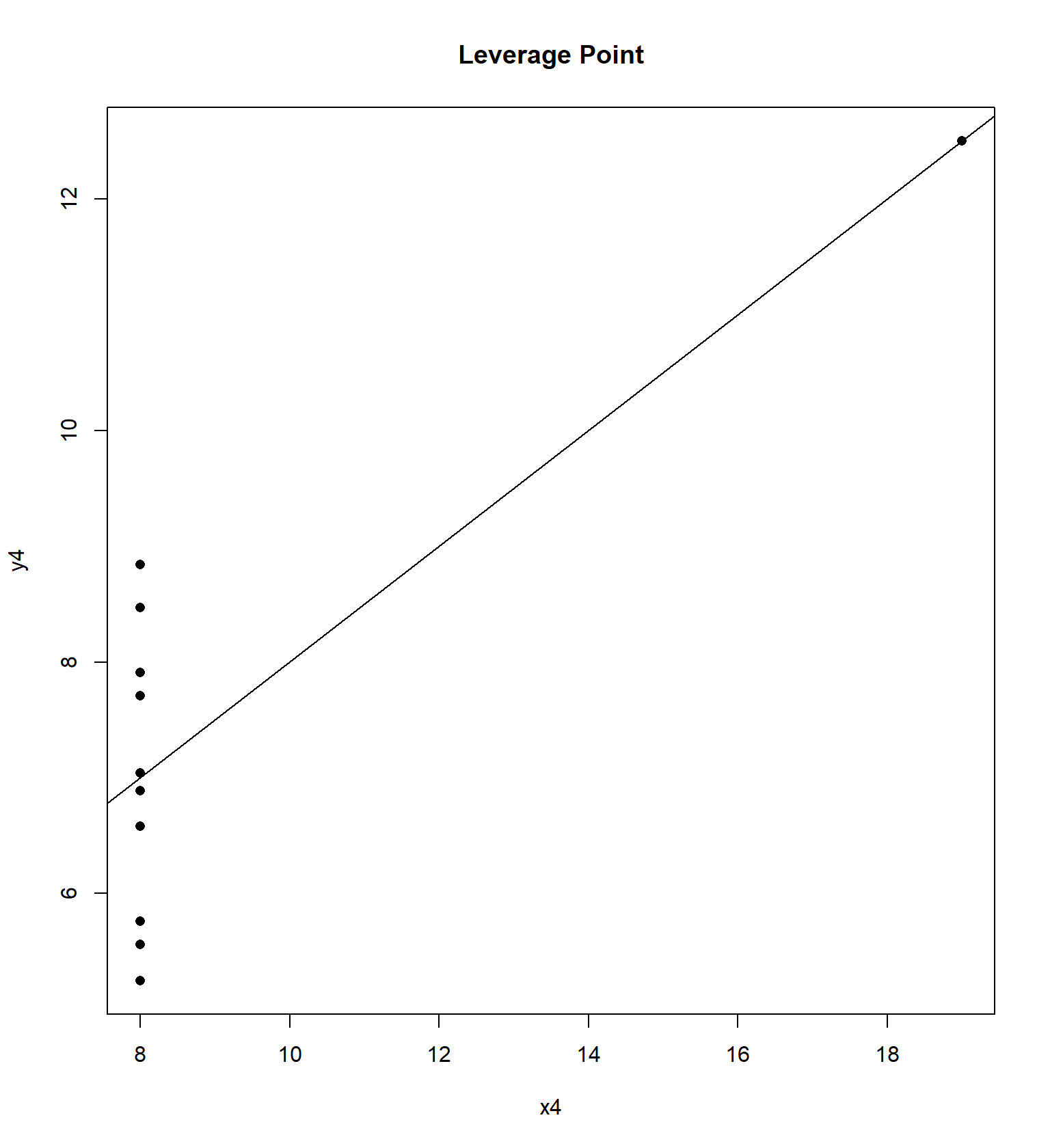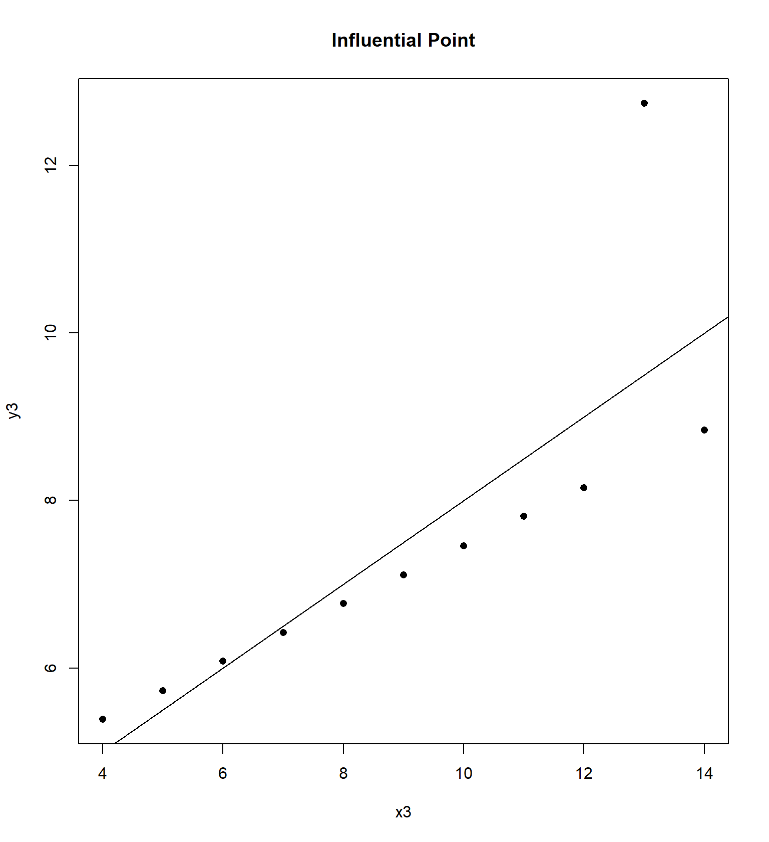 We will examine the “Anscombe” quartet of four data sets with the same correlation and regression equation, but four very different trends, originally presented by Frank Anscombe in 1973. For each data set, I have constructed a residual plot, plotting \(\hat{Y}\) versus \(e\) (predicted value vs residual) for each data set. This plot will ideally be “random”, without any sort of trend or correlation.