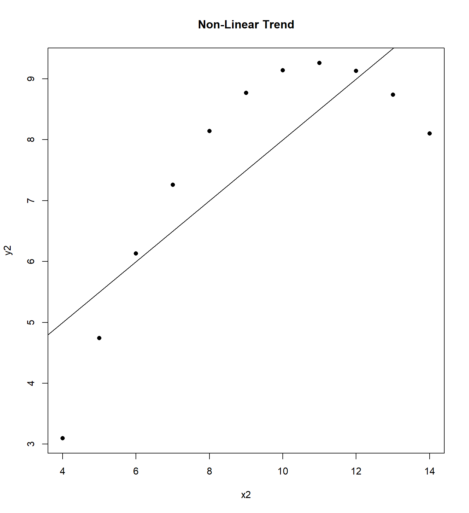 Then we fit a quadratic regression equation of the form \[\hat{y}=b_0 + b_1 X + b_2 X^2\] to the data. The QuadReg option on the TI calculator will fit this model. I’ll fit this model and graph the equation. It’s a better fit! One might also use this for the second data set from the Anscombe data.