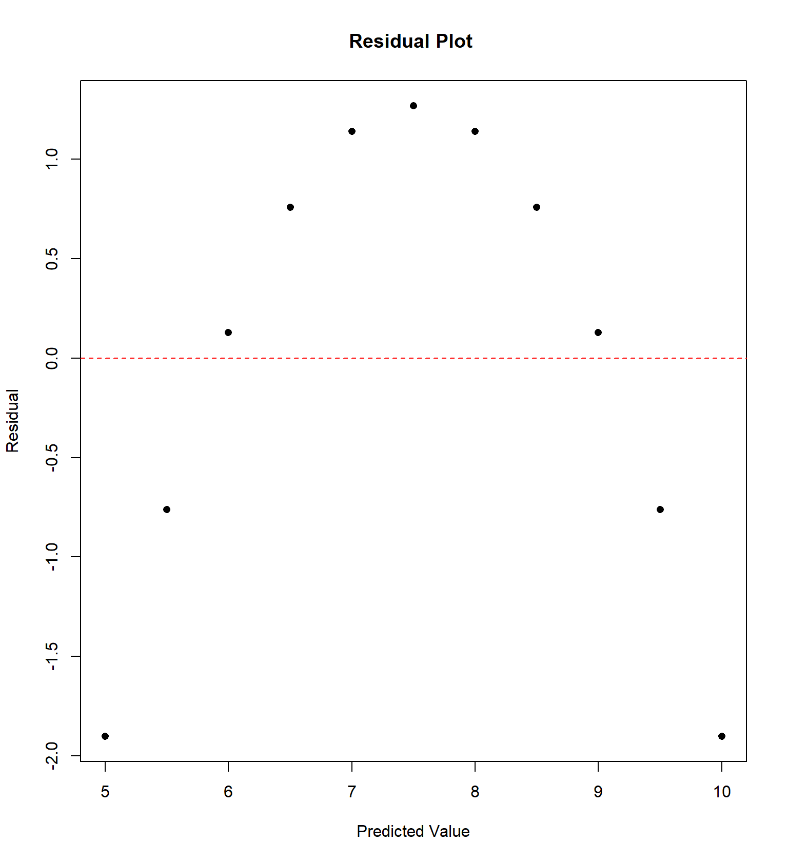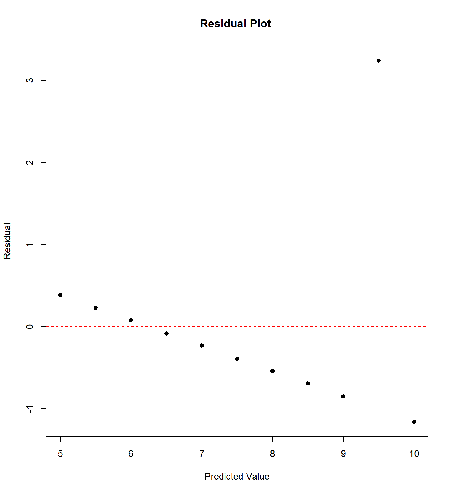 A plot called a residual plot can help us detect non-linearity, and other violations of regression assumptions. In order to construct it, we must compute the predicted values \(\hat{y}\) and the residuals \(e\) for each data point. We can do this on the TI calculator. Let List L3 hold your predicted values: L3=-0.974+2.206*L1. Let List L4 hold your residuals: L4=L2-L3.