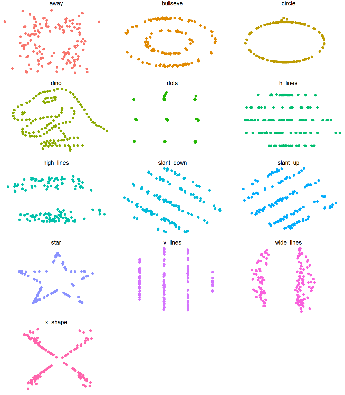 Here’s a more recent entertaining example, called the Datasaurus example that Alberto Cairo came up with. It’s similar to the Anscombe quartet in that data sets with virtually the same correlation and regression equation have wildly different patterns.