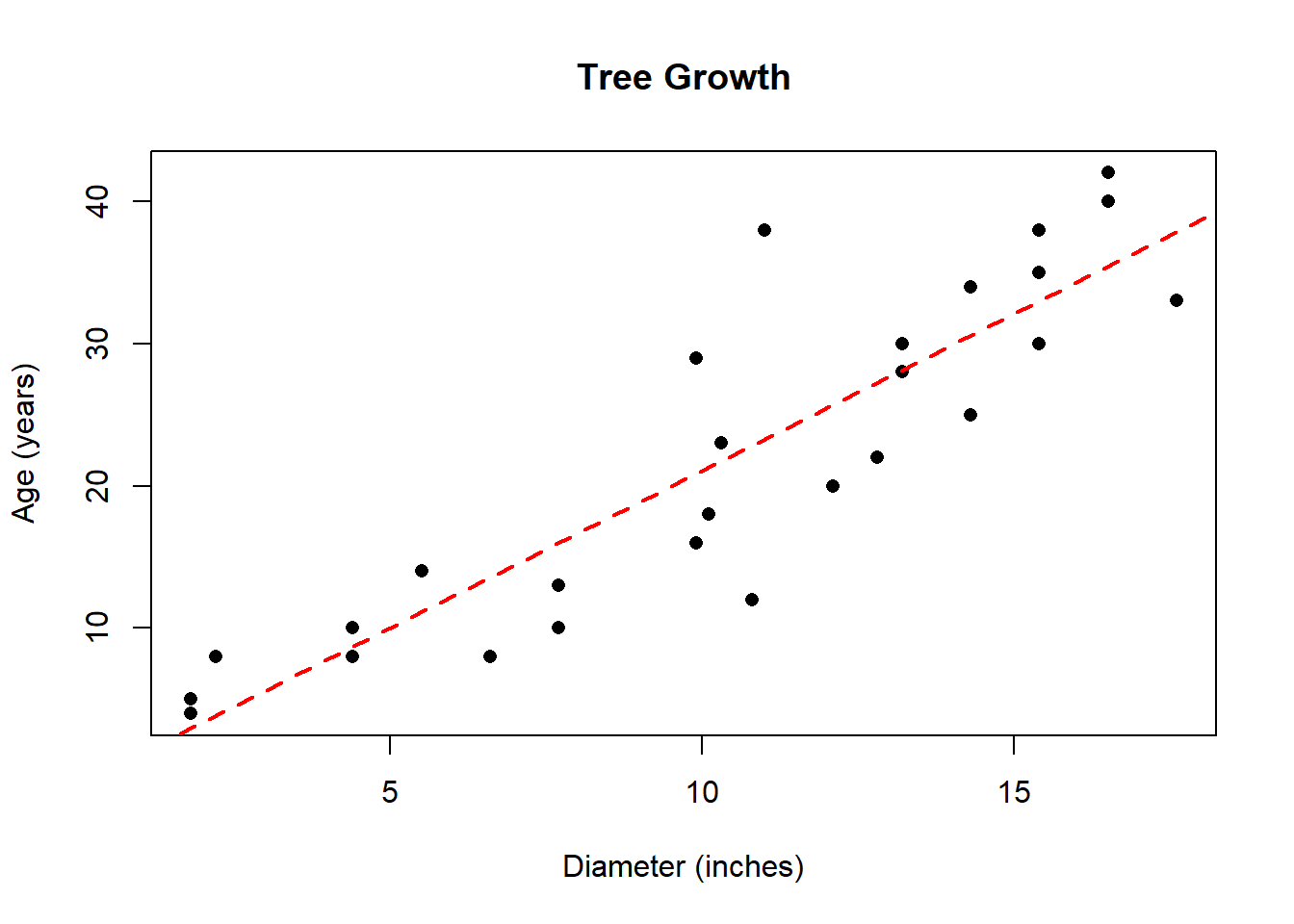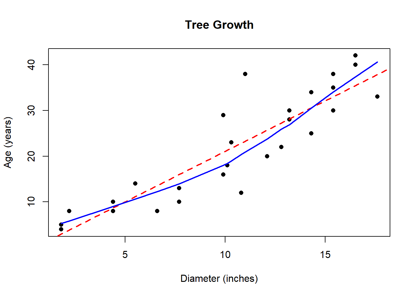 While the correlation coefficient is close to 1, careful examination of the plot shows the trend is somewhat nonlinear. In the following graph, I have superimposed a curve that estimates the true relationship between tree diameter and age.