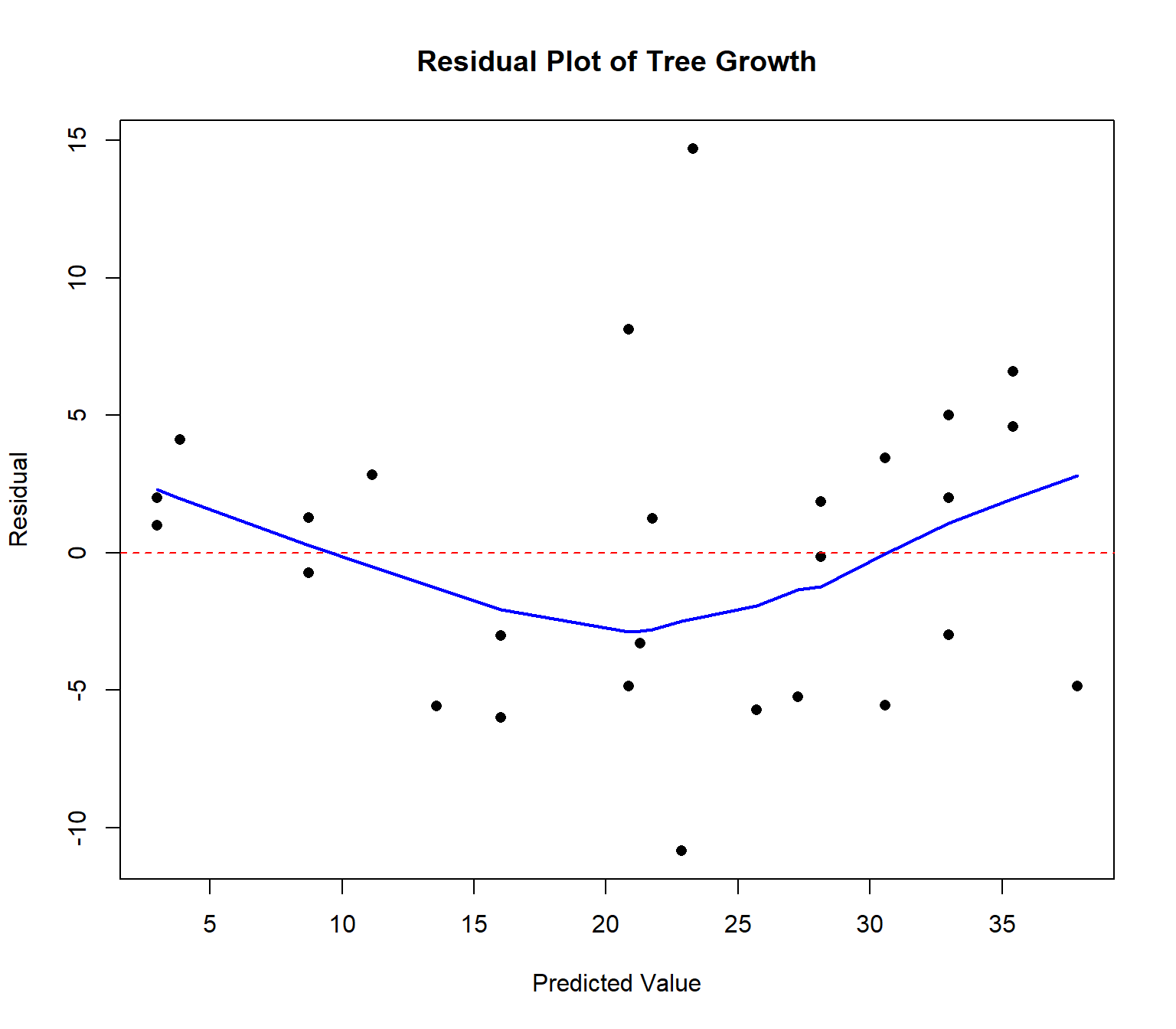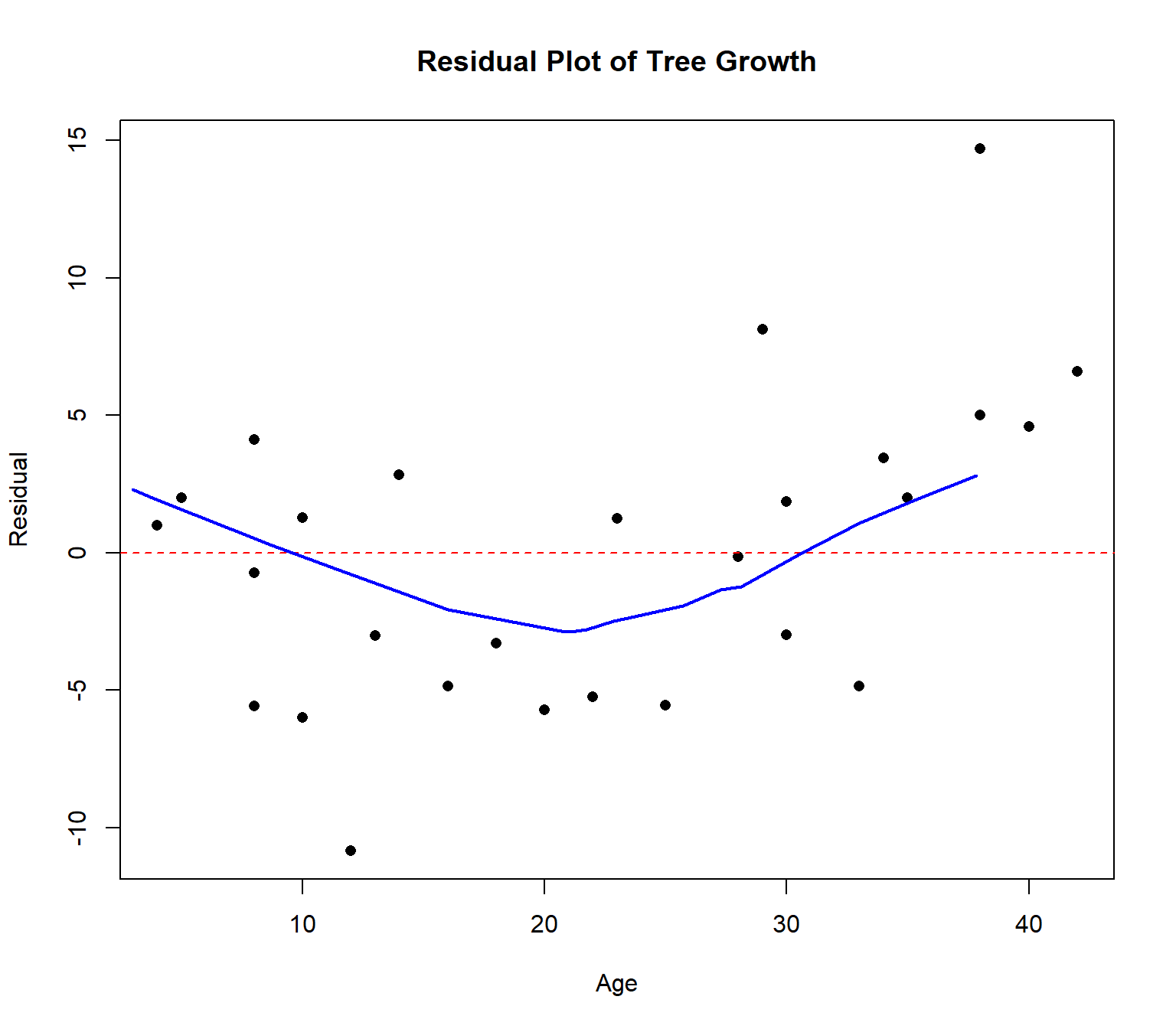 Ideally, the points in the residual plot are uncorrelated and fall in a random pattern. In this case, there is a curved pattern in the data. Notice the most of the largest & oldest trees have their age underestimated (i.e. the residual \(e\) is positive). Our model is biased and will predict larger, older trees to be younger than they really are.