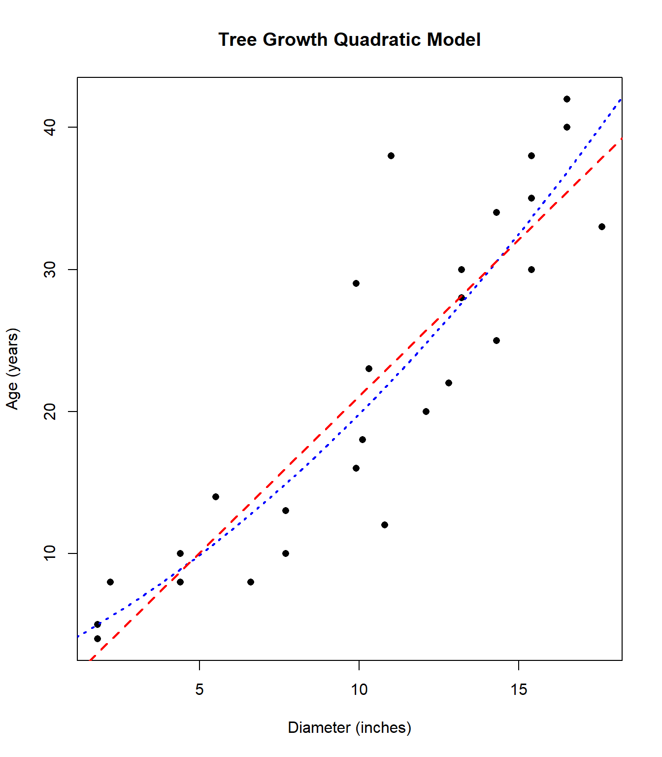 Maybe the cross-sectional area of the tree trunk, rather than the diameter, might be a better predictor of age. We could re-express the diameter in this case by squaring it, using both \(X\) and \(X^2\), the squared diameter, to predict age.