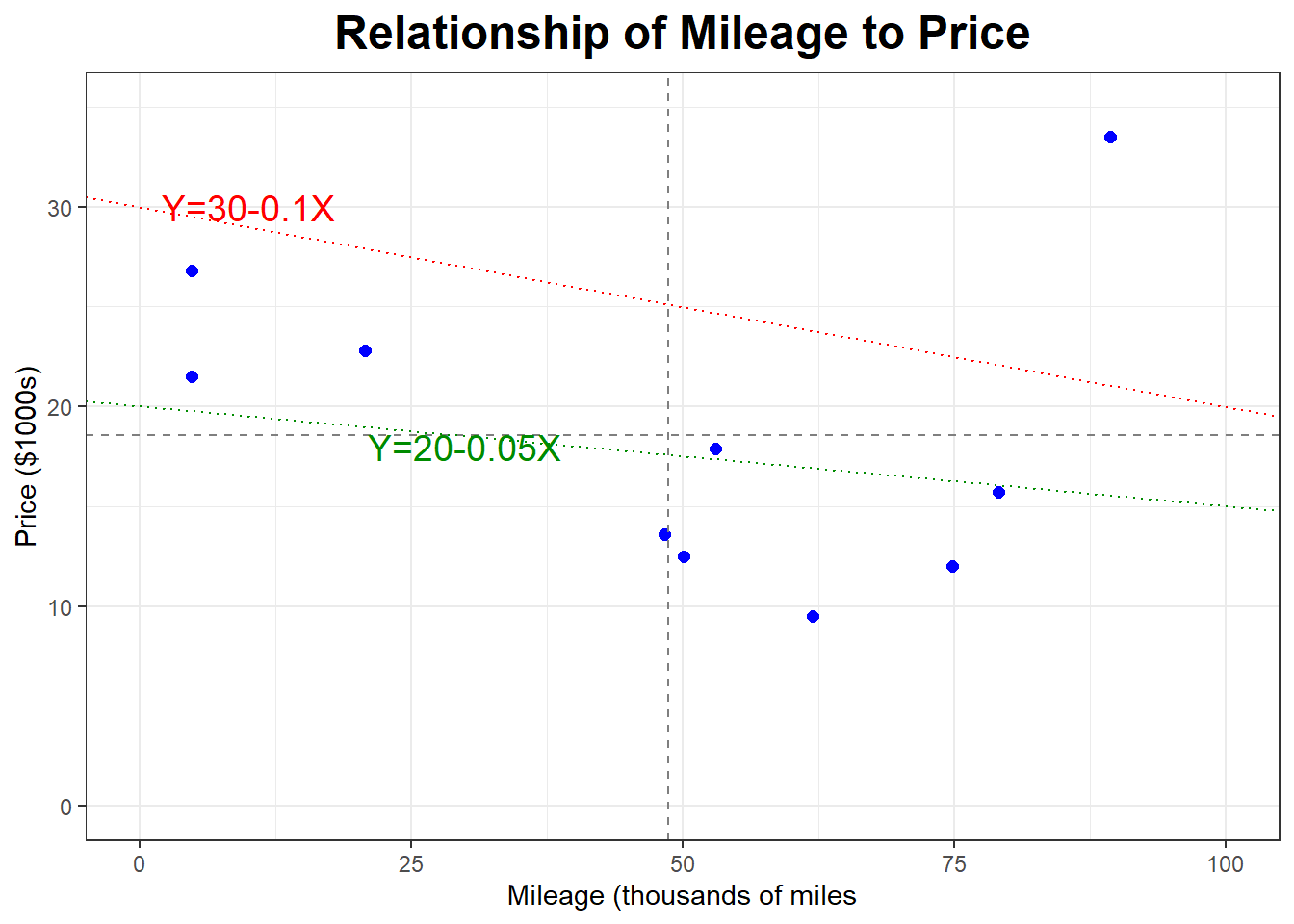 You might have noticed that one of the cars (Car #7) has Mileage \(X=89.4\) (the highest mileage car in the sample) but a Price \(Y=33.5\) (the highest price in the sample). Does this seem right?