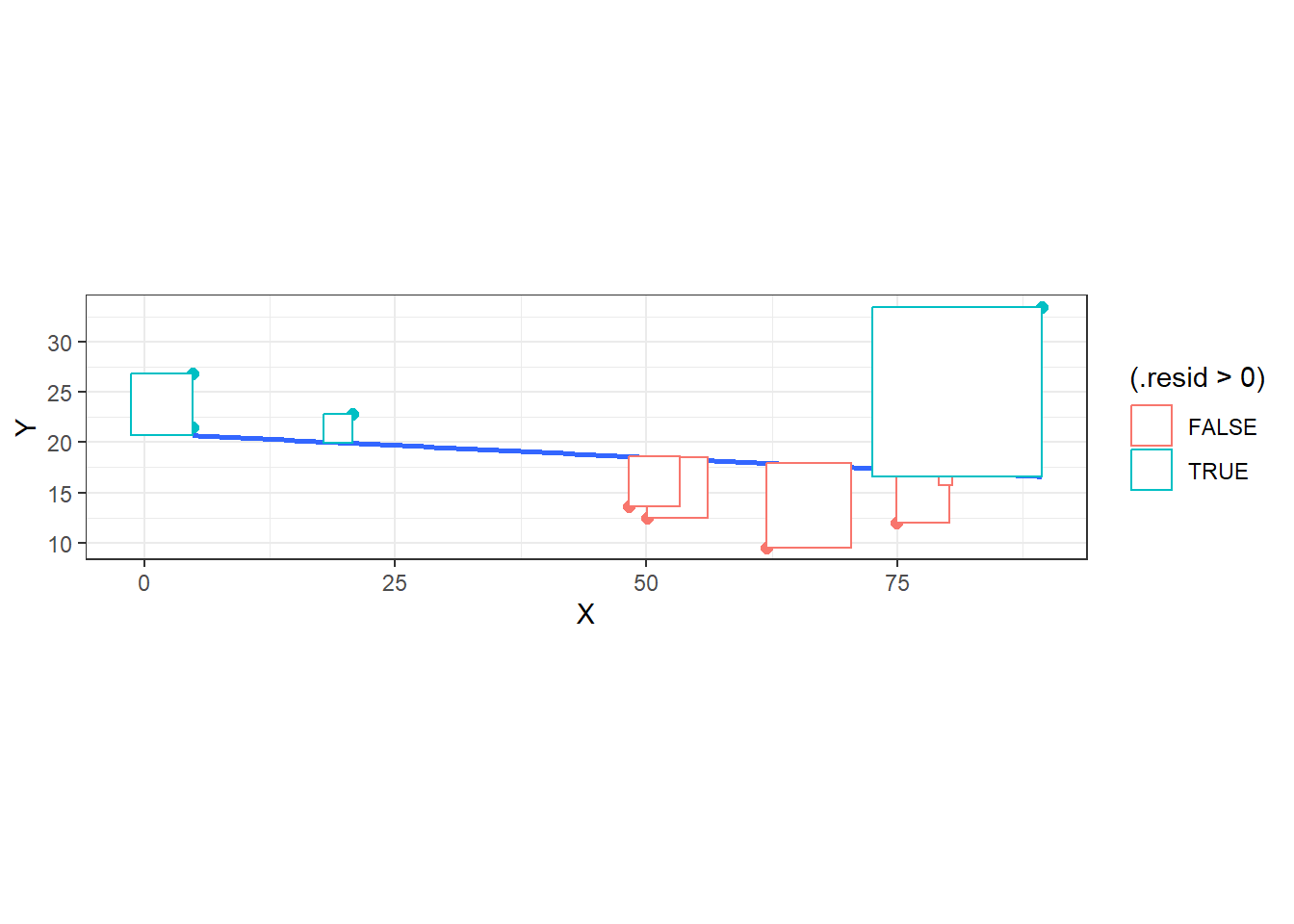 The blue least squares regression line is the one that minimizes \(SSR\), represented below as the area of the rectangles. No other line would make the area of those rectangles smaller.