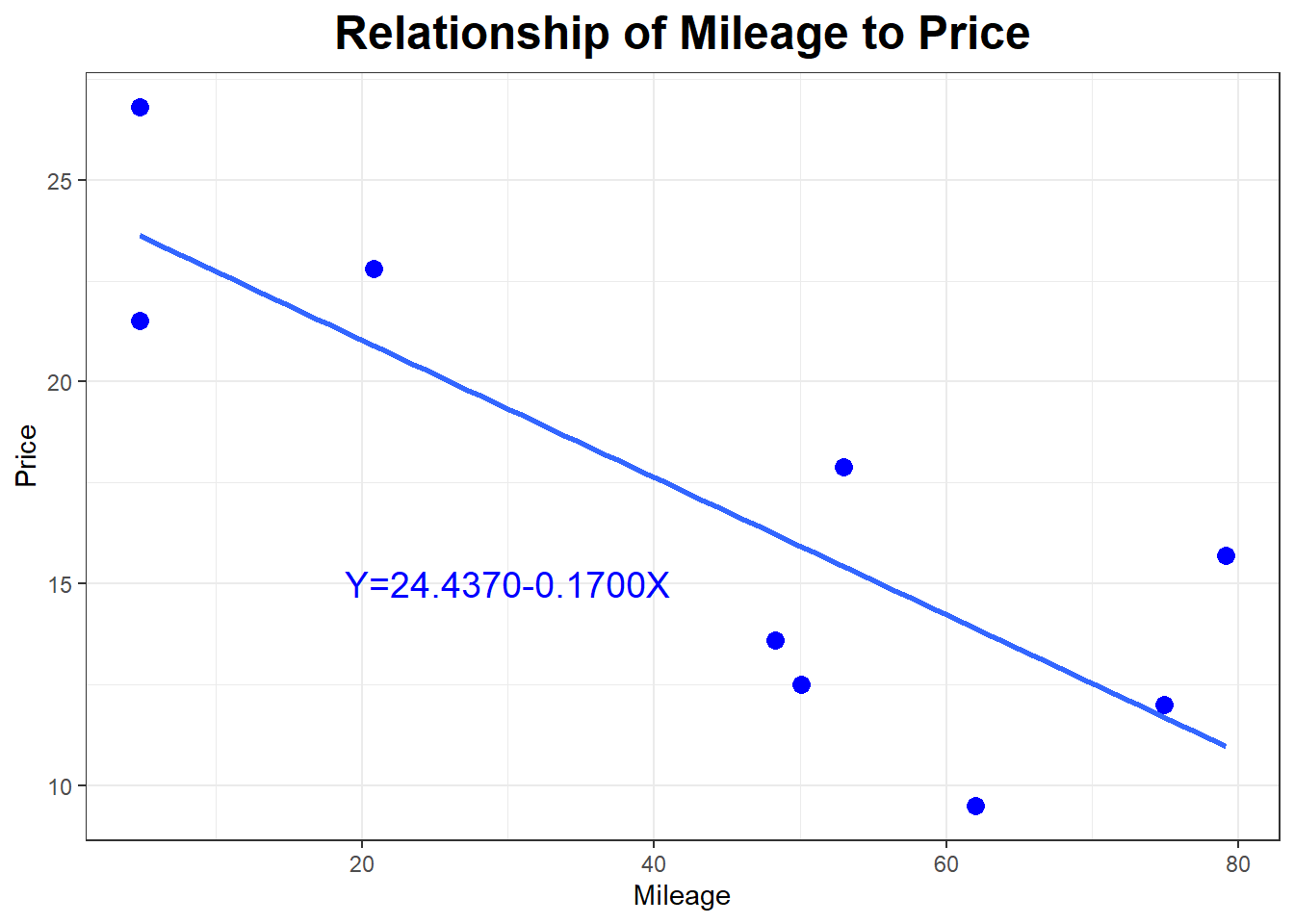with \(r=-0.8256\) (the expected strong negative correlation) and \(r^2=.682\), indicating that about 68.2% of the variation in Price is explained by the model using Mileage.
