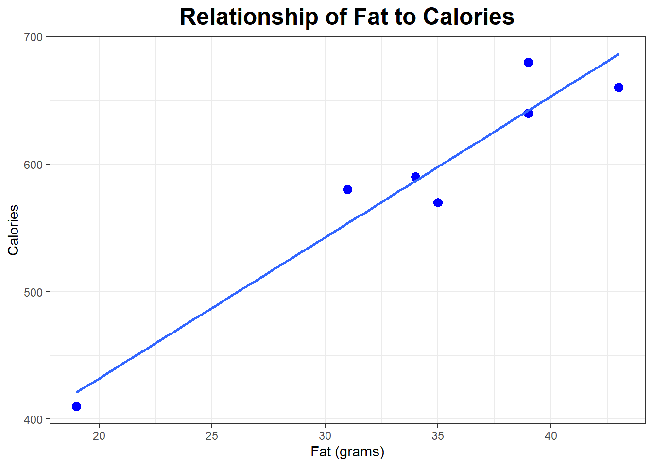 About 92% of the varation in calories in fast-food hamburgers is accounted for by the fat content of that burger.
