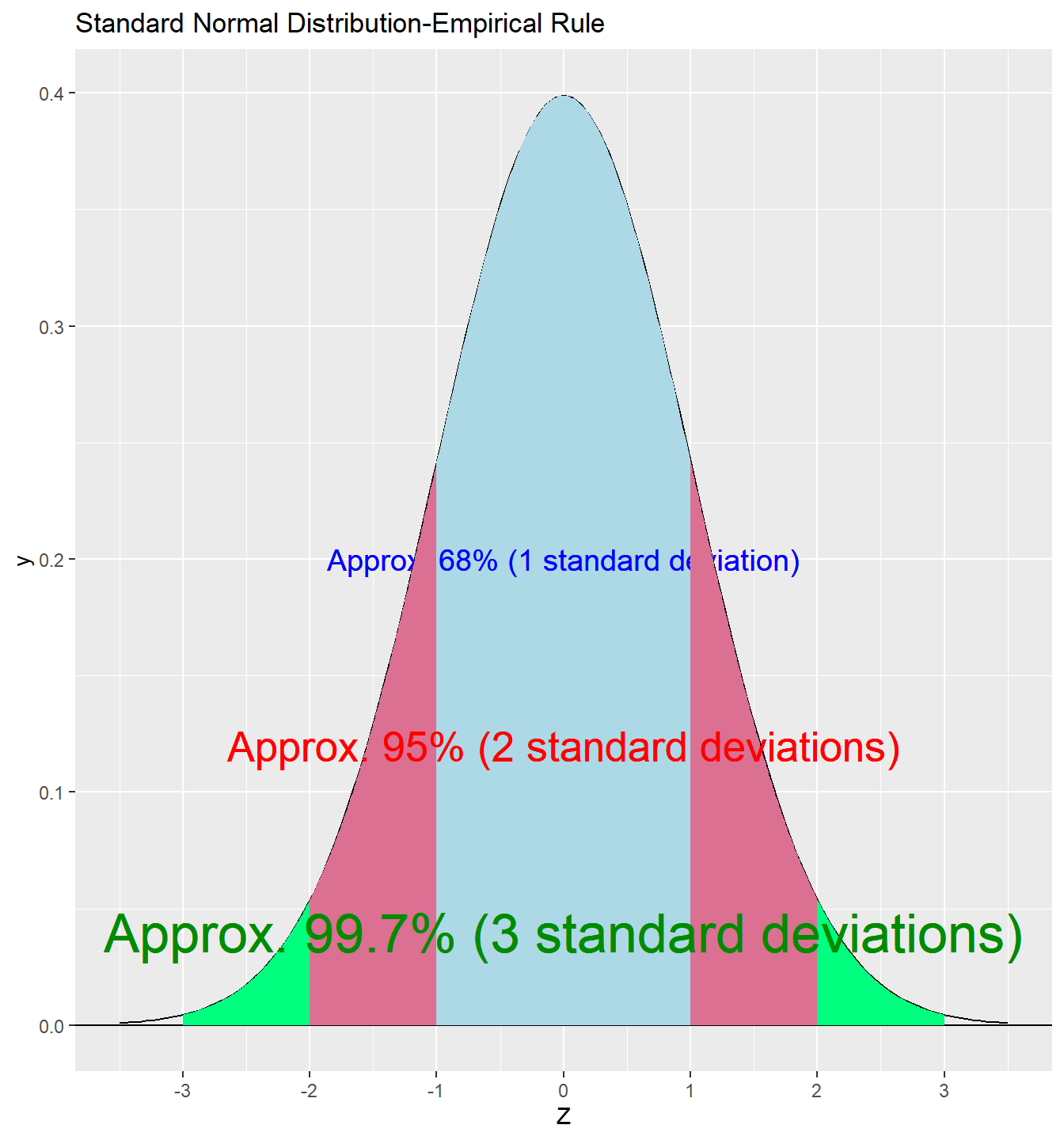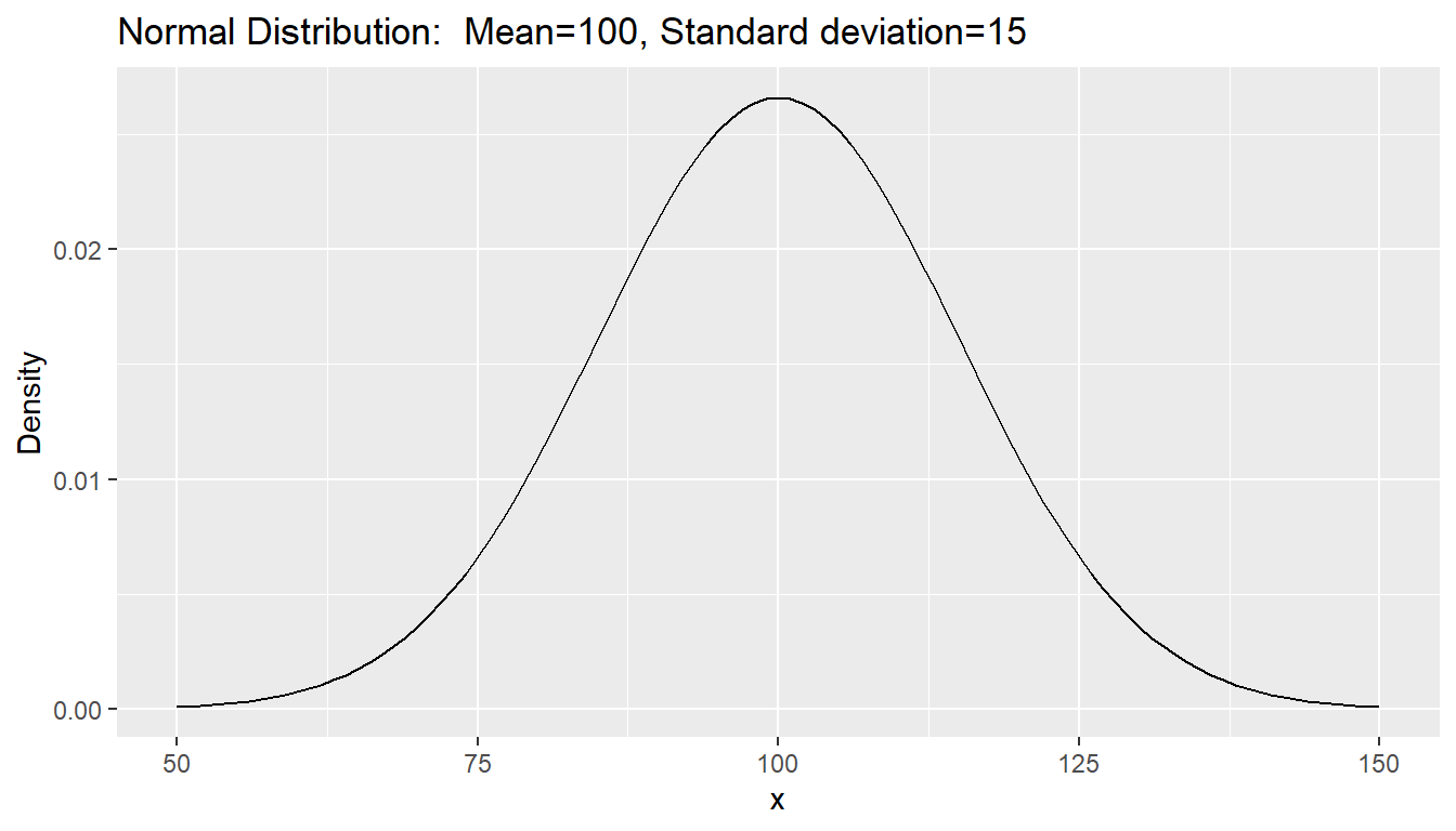 \[f(x)=\frac{1}{\sqrt{2\pi \sigma^2}} \exp[-\frac{1}{2}(\frac{(x-\mu)}{\sigma})^2]\] where the parameter \(\mu\) is the mean and the parameter \(\sigma\) is the standard deviation.