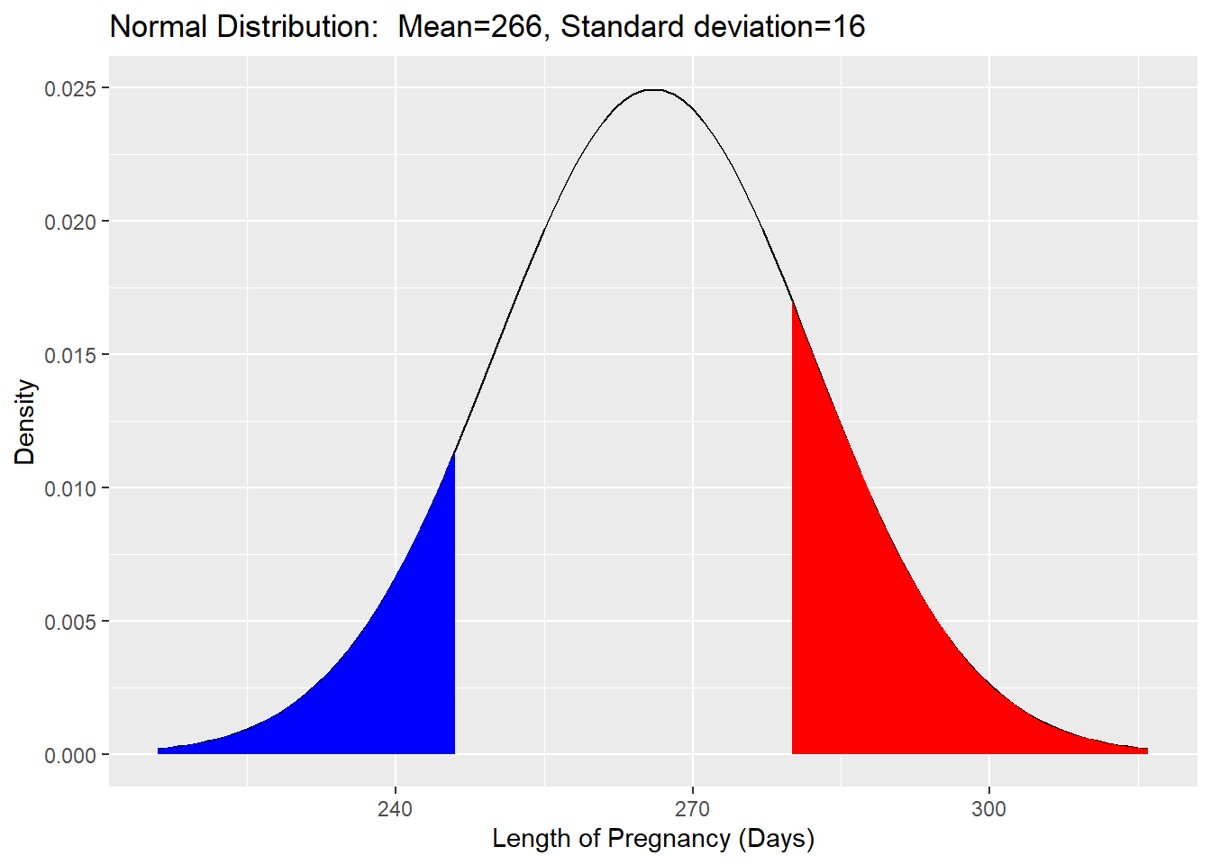 Assume the mean length of a human pregnancy can be described by a normal distribution with \(\mu= 266\) days and \(\sigma=16\) days. i.e. \(X \sim N(266,16)\). We want to know the probability that a pregnancy lasts less than 246 days, or \(P(X<246)\), represented below by the percentage of the area under the curve shaded in blue. Later, we will find \(P(X>280)\), which is shaded in red.